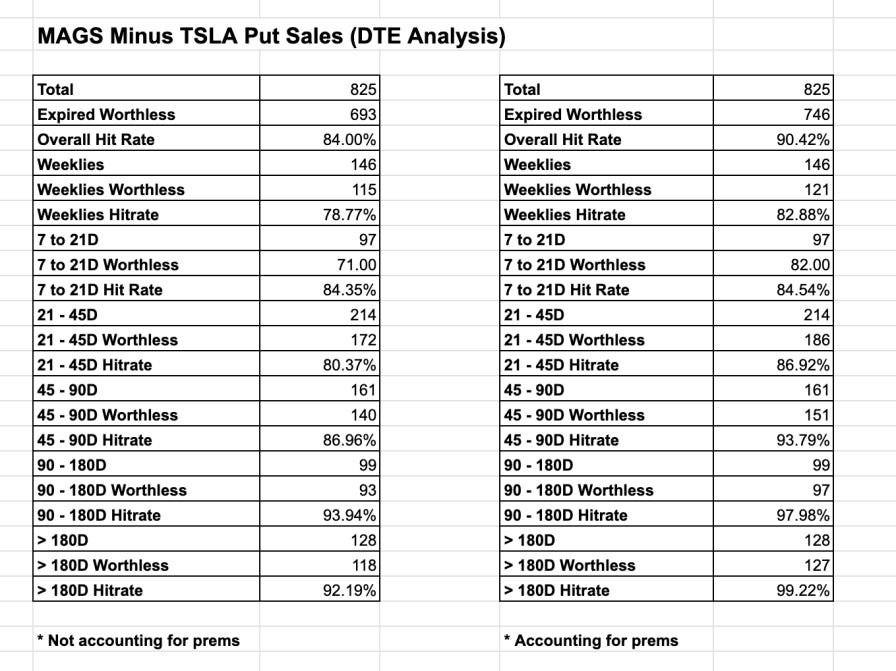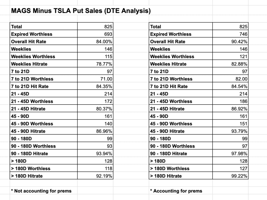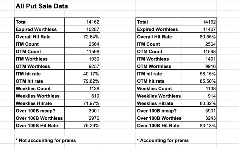One of the things alot of you ask me about is the put selling and why I prefer it to the call buying. So geoffbezos in the discord compiled all this data off my database. I asked him to do a longer write up and he’s hoping to have it for you all by this sunday. Basically he took every trade in my database since I began sharing it and he pulled up historical data on the trades including the price they were executed at and below is all his data. We’re trying to incorporate all this into the database and individual names but the thing that should stand out to you is why I always say the put sale data in the database is the most valuable. Down below you can see especially on the megacaps ex tesla, the put sales over 180 days out succeeded at a 99.2% clip. That is pretty remarkable and shows that big money is rarely wrong on long term put sales. More impressive is the fact that if I flag a put sale, 72.6% of the time it expires worthless and it goes to an even higher number over 90% if you just focus on the 6 megacaps ex Tesla. The probabilities of success are just much higher with put sales which is why you see me trade around this data with leverage. I increase the odds in my favor and I fully understand when to cut the leverage when the overall market breaks trend. Combining those two things is a very powerful thing in the market because you don’t have to be directionally right like you do with call buys or put buys, you can still win whether a stock goes up,down, or sideways.