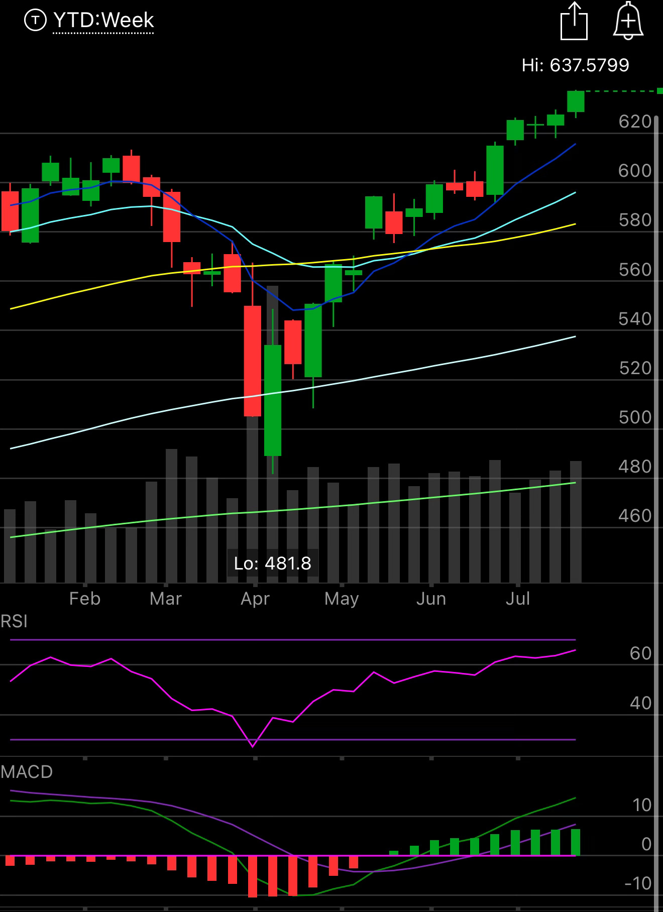 The SPY closed up at another all time high, this market has been nonstop since mid April and 12 of the last 16 weeks have been green, the market seems relentless right now but we do remain the most extended we’ve been from the 21 week in years with it still below 600 and the SPY north of 637. When will we touch that 21 week again I couldn’t say but we have not sniffed it in 11 weeks which is just remarkable and I don’t have the data but looking at charts it is one of the longest stretches ever.