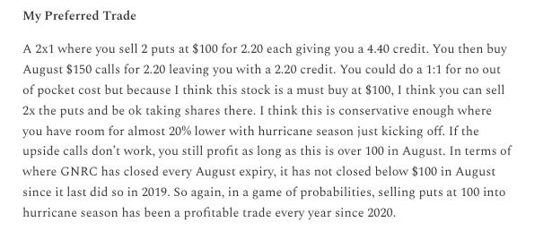 I don’t really discuss it much, but do you all realize the power of the risk reversal if you’re directionally right? The whole purpose of all this data is so we can be in the right names at the right time but when you actually swing at something with a risk reversal and hit it, the outcome is remarkable. Go back to all these weekend best ideas I’ve posted recently like AMD or GNRC you name it people always ask me why I discuss risk reversals and here is why, look at GNRC today up 15%, I wrote it up as a best idea on 5/25 here it was 122 then and 173 dollars today. The risk reversal below I put together for you paid you $4.40 to put on, today those August $150 calls went from $2.20 to $26. Your calls went up 13x and you got paid to take those calls, that’s why you use risk reversals because if these calls hadn’t worked, worst case you would’ve gone long at a great level. I’ve said it many times but being able to place trades for a credit is the ultimate life hack when it comes to markets if you’re a call buyer.