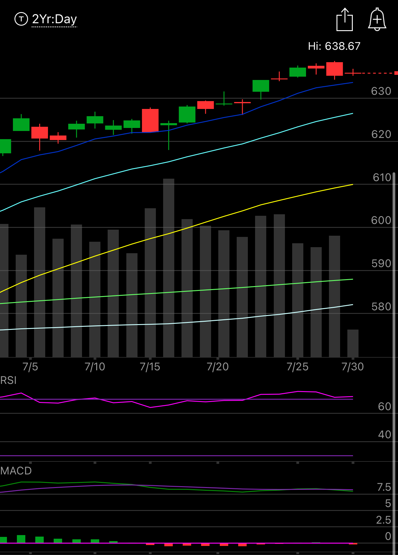 The SPY is doing nothing notable today, we’re all waiting on the fed today and what Powell has to say. Trump made it very clear in a post on truth social this morning that Powell has to cut rates right now and we all saw the showdown between the two last week at the fed building. Tensions are high and Trump is hoping to hear some good news today regarding the cuts. We have 4 of the 6 largest companies in the world reporting today and tomorrow which should have a major impact on our markets, so there is just alot going on right now which is why I stepped aside yesterday from all the leverage I was utilizing. Alot of people think they always have to be in the market, I’m completely fine with missing a couple days of action to be able to get some clarity and then pressing leverage in my favor when I have that. Who knows what happens today maybe we just rip higher off the 8 ema, these FOMC events are all over the place but for now the price action remains bullish I am just conservative enough to say I’ve made enough this year and I don’t care to partake in the risk the next few days. Even if the coast is clear after today, I would probably focus more on the shorter term trades because we’re something like a week away from the longest streak since 2000 for the Nasdaq over the 21 ema, this has been an insane run and these things do not last this long historically. So be mindful of that.