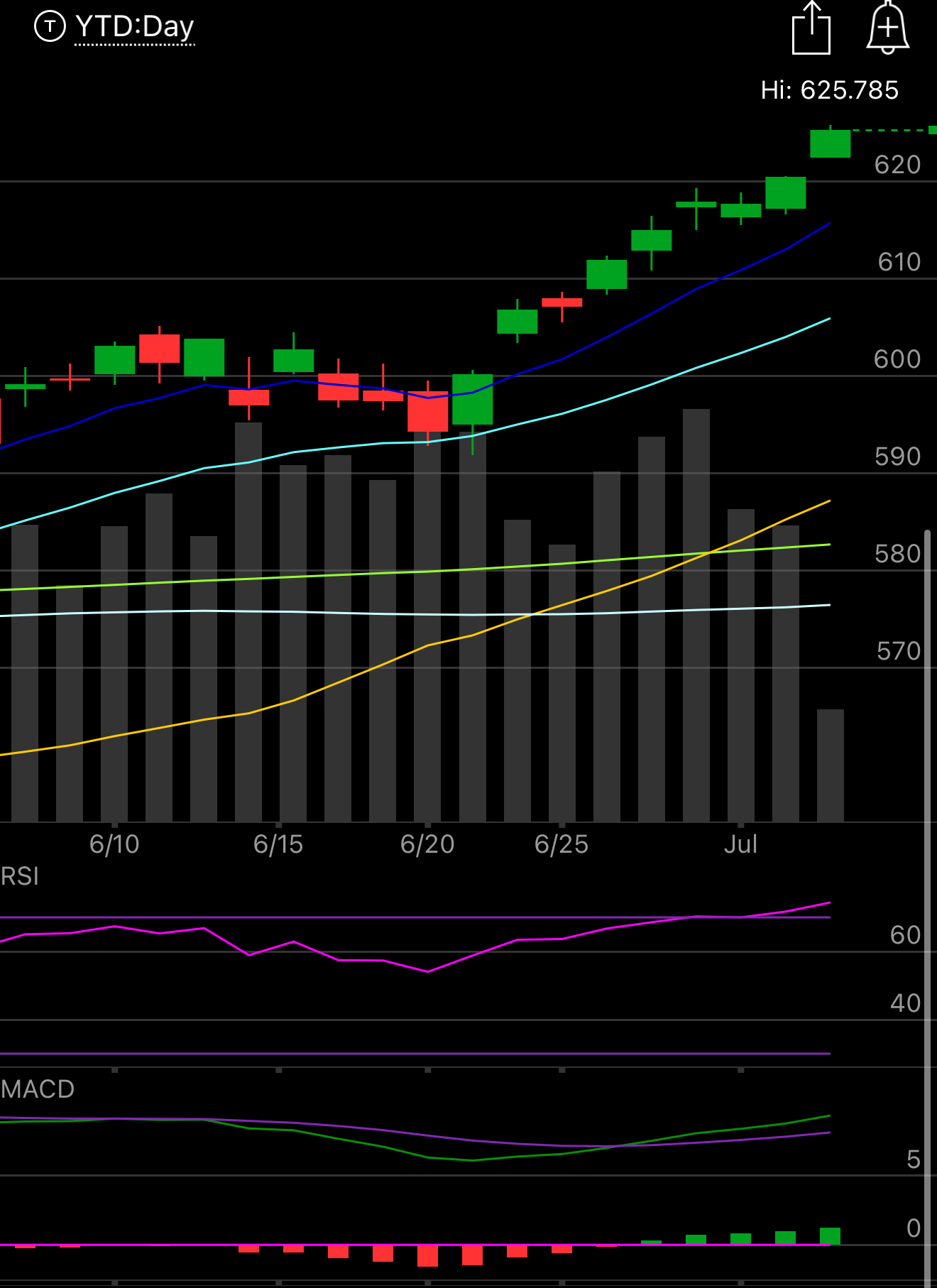 The SPY continues the strong drift higher, the most amazing part to me isn’t the move higher but the distance between where we are at 625 and where the 21 ema is at 605.94, it isn’t often we stay this extended from the month long moving average but we’ve done it for a few days now, this is very impressive and I do think we will have a period of sideways somewhere soon at least so the 8 ema can catch up. We have a long weekend coming up with a half day today and no market tomorrow, so nothing to really discuss until we come back monday but like I said it isn’t a common occurrence to stay this extended from the 21.