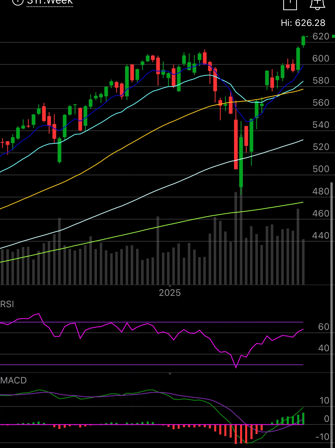 The SPY just had its highest weekly close ever for the 2nd week in a row. This is a raging bull market for now and the market is now up 7% on the year. The appetite for equities is so strong when there aren’t tariff wars at stake or wars looming in the Middle East. Equities are getting very pricey historically, but none of that matters as this breakout continues. In real terms, this isn’t as exciting as it looks because the dollar is continuing its plunge this year. If you glance at the chart below of the last 3 years, do you notice anything? That light blue line is the 21 week and we have never been this extended from it as it sits almost 7% lower. So if history is any guide we should consolidate or have a slight move down sometime soon to meet that.