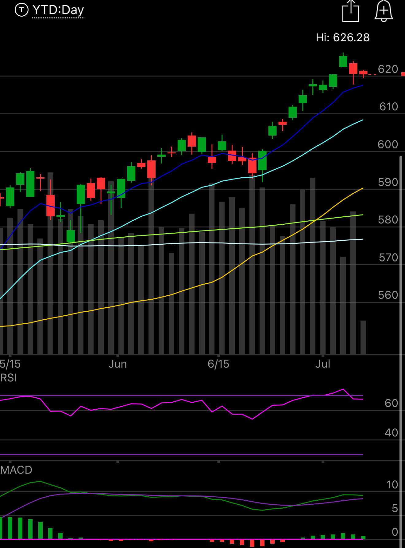 The SPY is coming into the 8 ema today, we discussed this on the weekend about how we were the most extended on a weekly basis as we’ve seen in 7 years. A small period of sideways/down is perfectly normal after the run we’ve had. We have yet to close below the 21 ema since April which is just textbook bull market and that is now up under 610. Look at the 50 day(yellow) continuing to rise through that 200 day(green) after the golden cross last week. There really isn’t a bear case at this moment from a technical perspective just a necessary cooling period where the moving averages can catch up. Things look ok now, but Donald Trump just walked out on stage to speak. We all know how much he can move markets with his speeches.