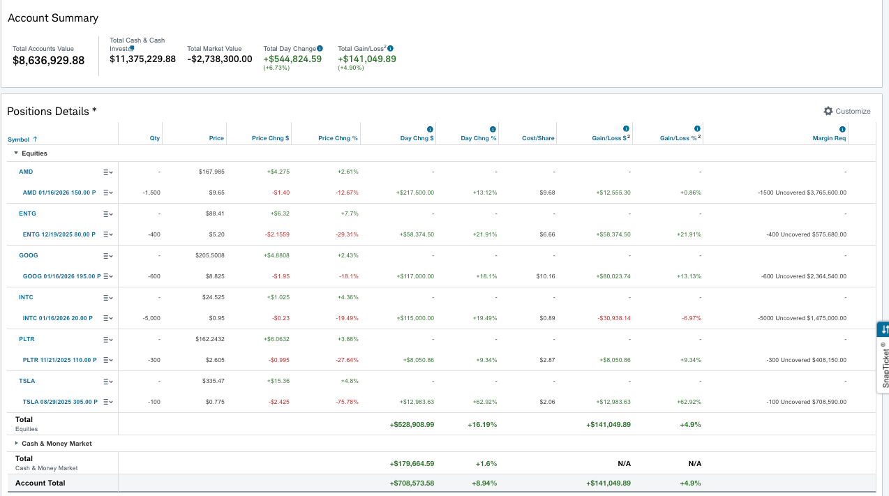 Now if NVDA has solid earnings next week and AMD can hold up, I am in a tremendous spot heading into the final months of the year and without another change I could end this year up 70 or 80% . Markets are at all time highs here, we should drift for a little bit and that would cause alot of quick decay considering there’s only 90 or so sessions left in the year. The thing for me that keeps me a put seller is the ability to profit whether markets go up or not. When you’re buying calls you better be sure we’re going up, but find good names with directional option flow, sell puts lower and a stock could fall 10% and you still profit by expiry. The increased probabilities of success are why I do it. Still though, you have to respect these moving averages because you can’t use leverage and be uber long when the market falls apart or you will blow up. Being a little prudent will save you a lot of pain and suffering like today instead of being levered out to the max I’m probably 70% as levered up as I normally am when bullish and we’re cruising over all the short term moving averages.