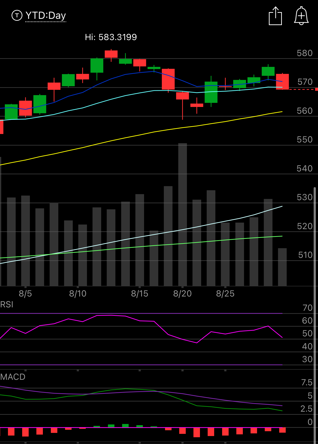 The QQQ is losing the 21 ema as you can see below, will we close above it today? We will have to see, but right now 570.09 is the level to watch today. If you look at megacaps, outside of Google and Apple, everything is weak and has been for some time. Our entire market depends on tech stocks going up and when they run into patches of weakness, which a close under this 21 would normally indicate, then the overall market struggles. NVDA broke the 21 ema in a big way today and this is very notable as it is 8% of our market and while it sits at 173.50 right now, the 50 day is just 3 dollars lower, if it breaks that, the market is going to be in trouble.