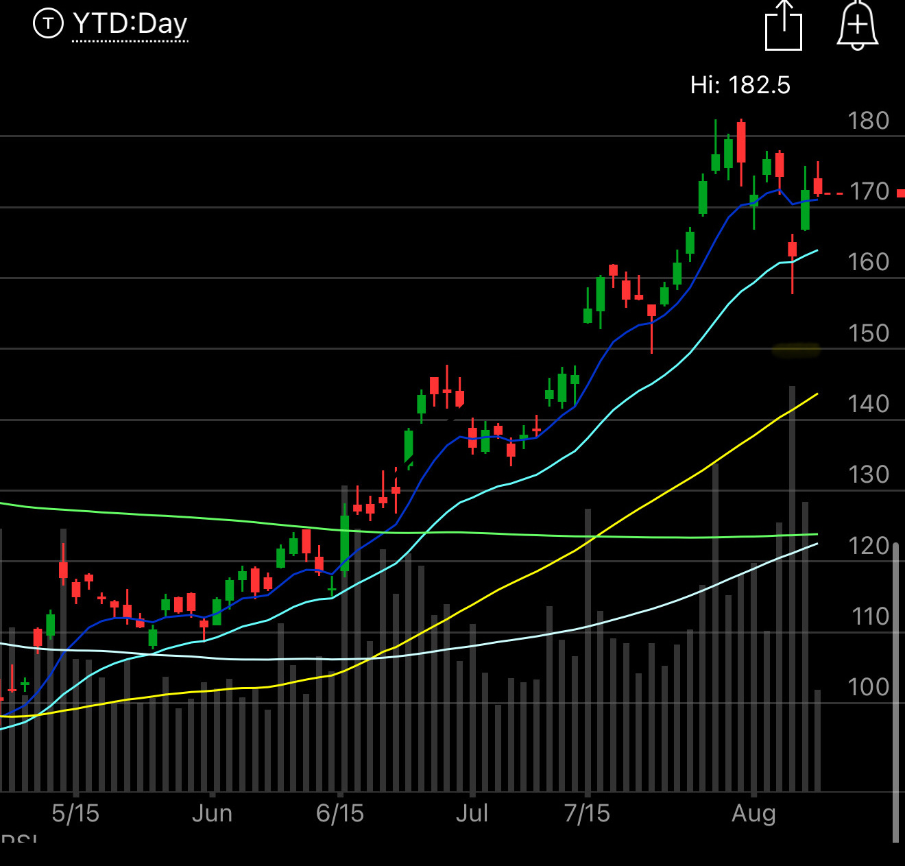 Take a look at AMD below, look at that 21 ema(light blue line). Look how it perfectly held it this week and resumed higher after that weak earnings reaction. Do you see why I consider that the most important moving average in the market? It keeps you in check on whether you’re in an uptrend or not. Look how many perfect bounces off the 21 ema AMD had in the last few months. When you’re looking at a chart you can always sell puts off the 21 ema and if that closes below there, you close up the trade for hopefully a nominal loss. You have to be mindful of where that is on everything and this chart from this week is a perfect representation of why.