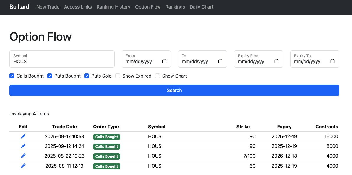 One that made me laugh this morning was HOUS, I didn’t even know that ticker but last week on wednesday someone bought 16,000 calls in December at 9 following someone who bought 8,000 calls at the same strike 5 days earlier. This morning it popped 55% on a takeover. I do try my best to highlight the interesting names but alot of times when I see stuff like this I just assume it is junk and some discord room pump and dump, but if you see something odd like this, taking a gamble isn’t the worst risk out there. I’m sure these calls went up manyfold today and this buyer was just lucky on their timing!.
