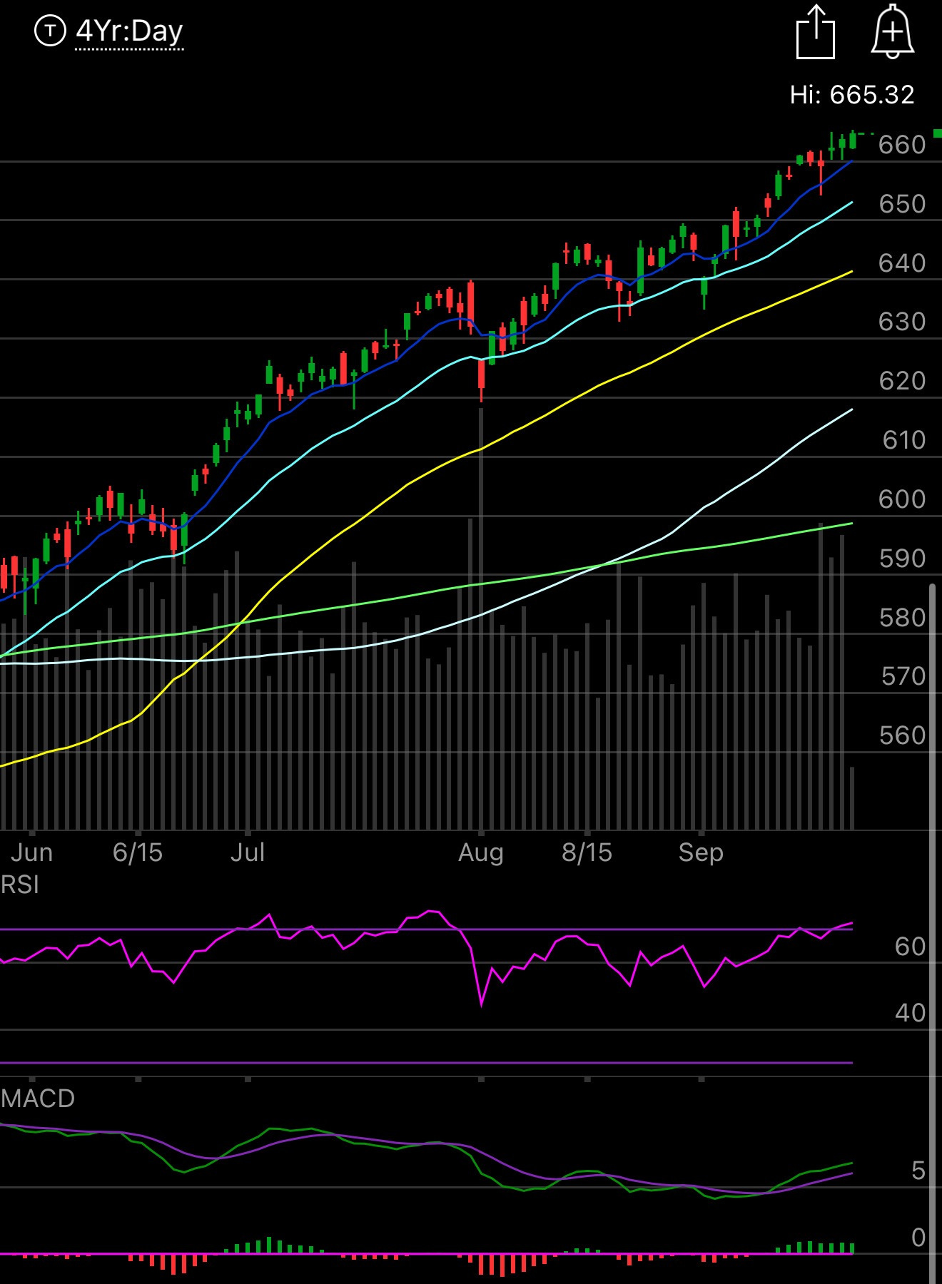 The SPY is now past overbought levels for the first time since July, look at the RSI below and you’ll notice the last time we did this we got a quick 2 day selloff to cool things down. We have to be near a small dip at least when you’re this extended. Earnings season kicks off with banks in 3 weeks, until then we really don’t have any catalysts just the daily which megacap is going to carry the market thing we’ve done for the last few weeks. Today it was Apple rising 4% along with TSLA up 3.5% out of nowhere doing some serious lifting this session.