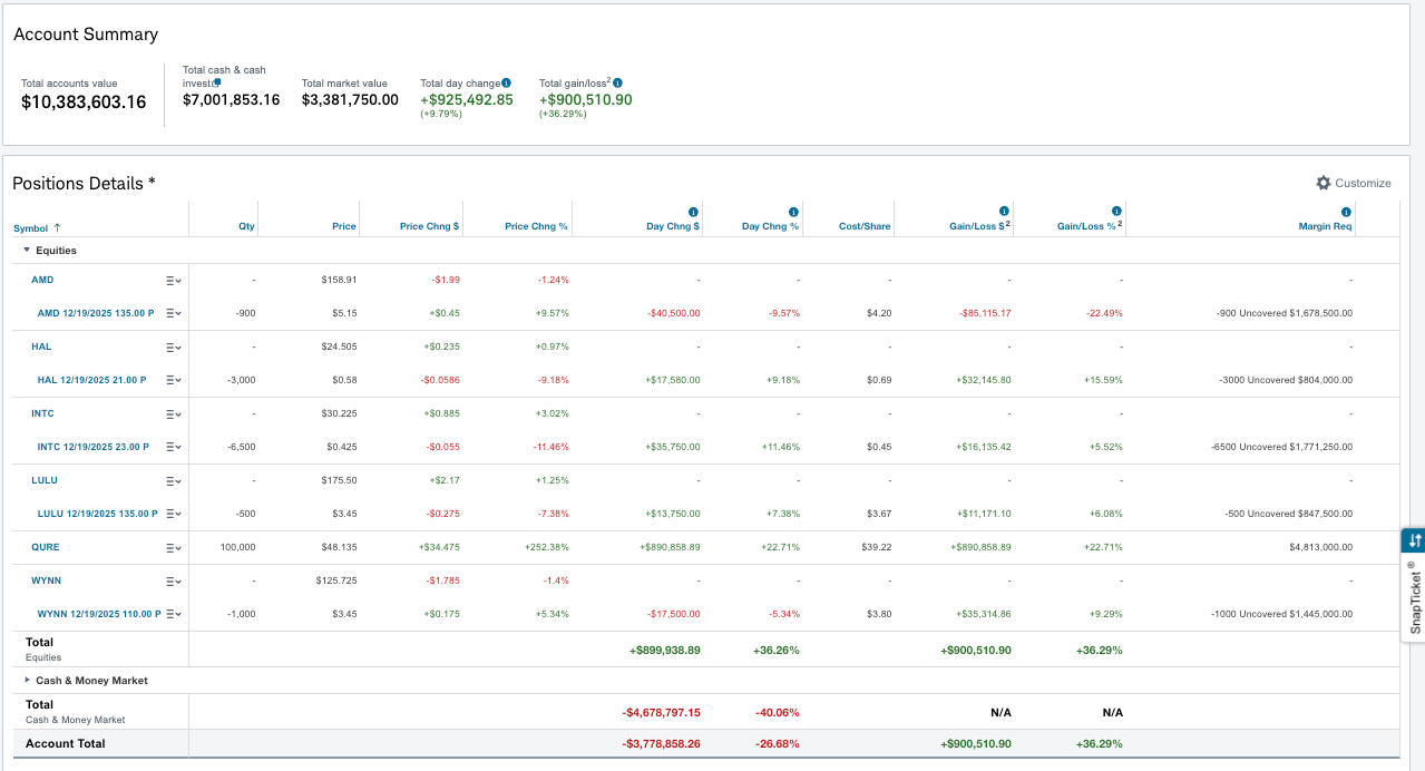 When you look at my book below, aside from the huge capital gain I already have this year, remember I started the year around $6m, I have a ton of short puts expiring this year which should net near $1m by December so my thinking with this trade is yes 100,000 shares is a ton but I have $10 of downside protection let’s say to where if my short puts go to $0 and I believe they will, they would cancel out a big loss in this should it come. If it goes beyond that, great, it dips into my capital gain tax bill I have coming. So again, my situation is not yours, so please don’t take a crazy risk like me unless you have a plan in mind. I have mine here and I’m fully aware there will likely be a capital raise and likely some sort of short piece out soon because that’s what happens with biotechs, they’re junk ripe for attacks. So the TLDR of this is if my short puts work and I even sell this for a big loss at $32 by year end, I will still be up overall from where I am today.