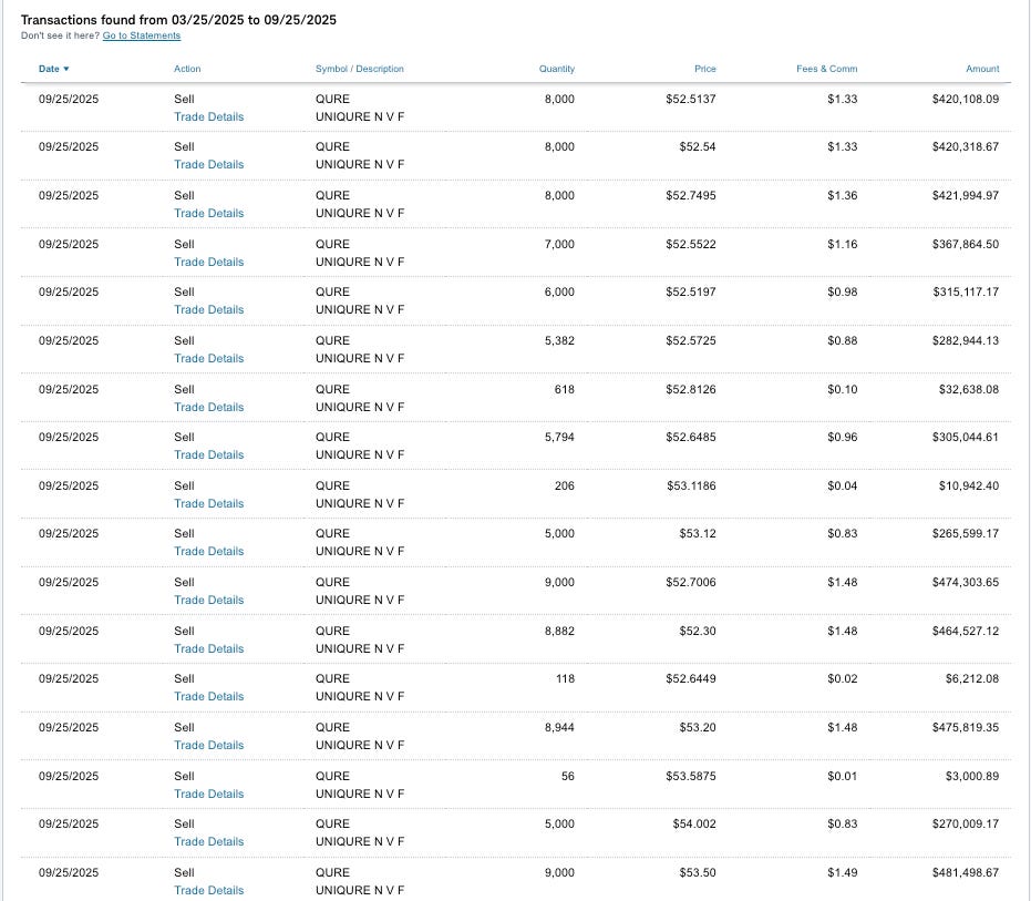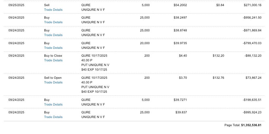 I don’t even know what to say here, the last 24 hours have been easily the craziest of my trading career on my own. I’ve never really made that amount of money in 24 hours and it just came out of nowhere considering I literally had not heard of QURE until Shkreli tweeted it. It’s a crazy story to say I made $1.4m in 24 hours based on a tweet, but I did. It was just one of those right place at the right time moments seeing the tweet on my feed and knowing Martin’s prowess in the space. I sold it all premarket today above 52.51, I couldn’t believe where the stock was this morning gapping up another 15% after an offering and I just slowly sold out trying not to move the stock. With a low float name like this you can’t just dump 100,000 shares like it’s Amazon, you will crash the stock. So I sold in blocks until I got out, the total gain was $1.35M in 1 day, that’s insanity, moreso considering I’d never make that in a session on any of the normal names I’d trade but I took a big risk and I got a big reward, that’s all there is to say. Here all the trades I made: