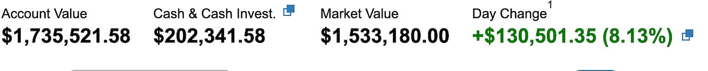 Well, I’ve made more money in one day in regards to my overall portfolio being up, but I keep things separate and really don’t discuss my buy and hold names because what’s the point, over time, most stocks go up. My trading account is where I focus on shorter term moves based on technicals,options flow,etc and that’s what I discuss here daily. THAT HAD AN INCREDIBLE DAY.