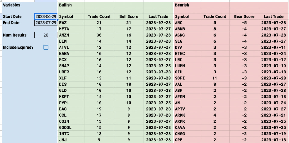 He basically took the the longer timeframe of the trends section I share everyday and came up with his own system where he focuses on the top trending names and swing trades them intraday. Now think about that, it makes sense. If a name is seeing repeated bullish flow over longer timeframes, you probably want to be in that name. Here are the top trending names of the past month and most are up ALOT. Granted the market is up alot too, but these names below had some of the biggest movers.