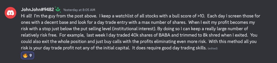 I’ll start posting some of my trades in the discord as I take them. Typically it will be a day trade trimmed to a swing trade position. You have to make your own trades... DON’T just try to copy or you will by nature have late entries and exits and not the same results. I just want to relay something I’m doing that is working well that perhaps others can model in their own trades.