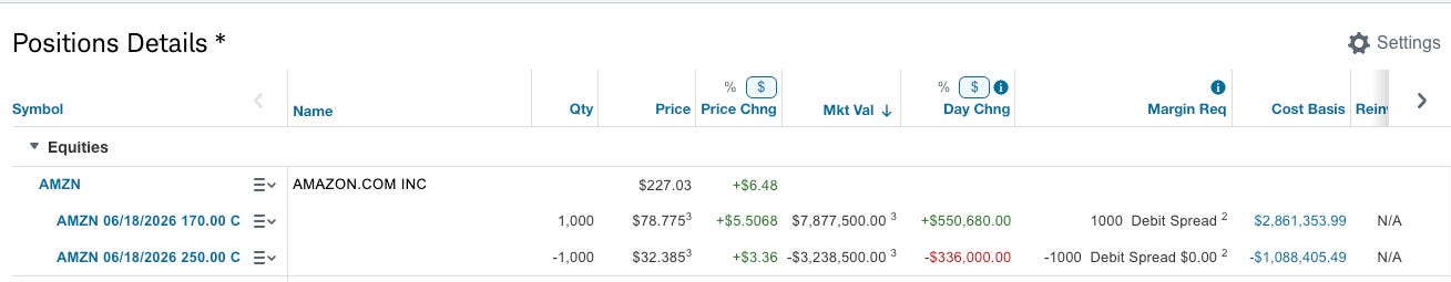 Should I have been up more this year? Yea probably but I’m extremely conservative, it has its pros and cons. Take my big Amazon trade below, I turned my $170 leaps bought in early 2024 into a call spread as Amazon rose, when Amazon crashed to $155 in August I looked like a genius but now that it has rallied, it has crippled my total return to a degree. The calls I sold for $13 are now $33 almost and are down huge technically but the reality is I capped that trade and now the max return on that trade is the spread $250-$170 which is $80 + the premium $13 so $93 total. The trade currently sits at $46.39 meaning I have alot to go until the max value of $80 is achieved simply if Amazon rises from $227 today to $250 by June 2026 on 1000 calls which is 100,000 shares. So yes, I am in an incredible spot right now where if I do nothing for another year and Amazon just rises 10%, I will make a fortune on a massive position. If you have these leaps and have not sold calls vs them I highly suggest you do even higher than I did at say $300 and try to recap some of your cost basis if you think you’ll be in the trade that long. I had always targeted $250 or so being my exit point because the max fibonacci extension off lows is there at 255 so getting $13 in premium for me was a $263 exit as I expect Amazon to stall around that 255 level when it gets there.