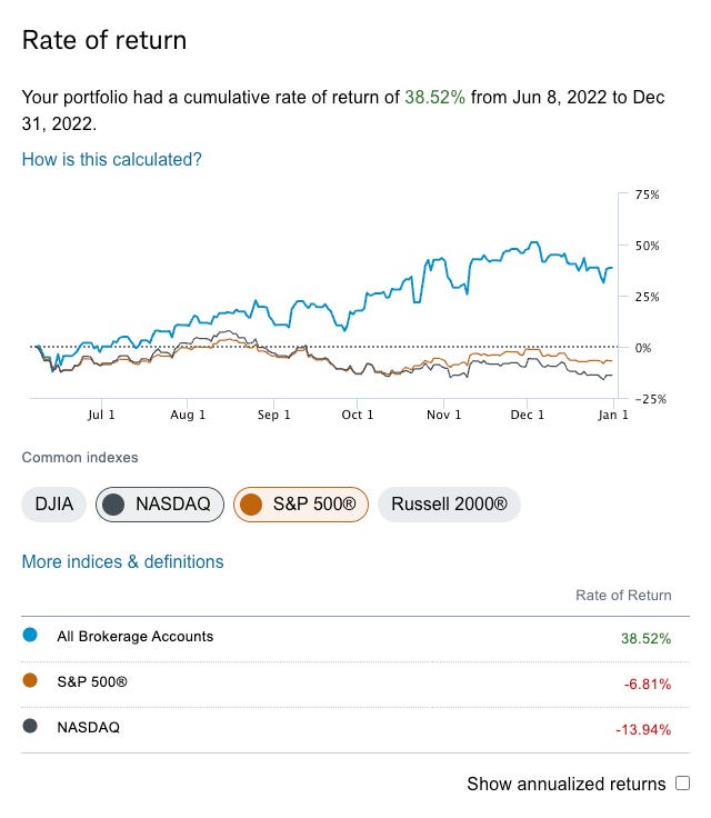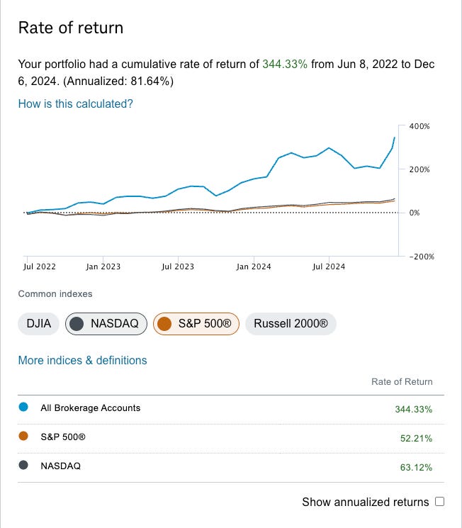 Since the time I begin writing this substack and sharing all I do on June 8th, 2022 I am up 344.33% vs 52.21% for the S&P and 63.12% for the Nasdaq.