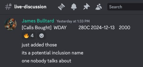 A lot of you ask me if the live part is worth it? Take yesterday for instance I send out the recap everyday mid day for those who want to daytrade off the data. Still even after I wrap up if I see something interesting as I’m logging the trades, I will note it for the live group. These WDAY calls came in at 2:33 EST for next friday, I mentioned that I added those to the database and they stood out because that was a potential inclusion name. Sure enough afterhours, it was included in the S&P and those calls are up 500%+ now.