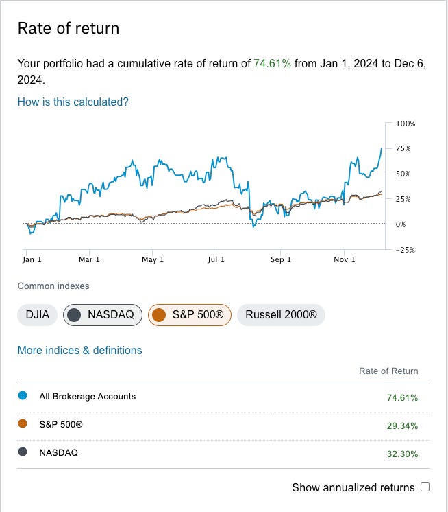 There’s not much to say, everyone that owned stocks did well this year. I really only made a handful of big trades, you saw all of them: AMZN,AAPL,FOUR, and IBIT were the big ones. I was so busy dealing with my dad all year I had to take longer term trades utilizing leverage if I wanted to outperform while not staring at my screens all afternoon. I really had no time, I’d do my work in the morning, share my recap and head to the hospital near daily for 6 months. I couldn’t hold short term positions because I just wasn’t around. I tried to look for names with repeat option flow and attack there. It wasn’t the approach I took in here all of 2022 and most of 2023 as I was trading daily and sharing what I was doing, but it worked and in the end that is all that mattered, here are the final results.
