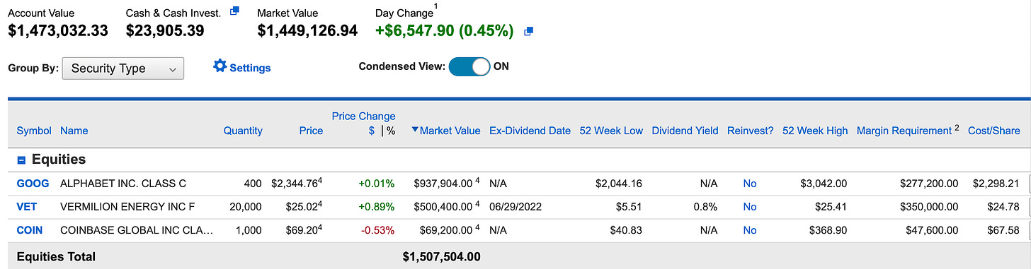 These are all the options positions I have open at the moment. As you can see from the graphic above, I am long only 3 positions right now. $GOOG at $2298.21 and you can see I sold $2,310 calls for $32.49 which would have me called away at $2,342.49 for a nice 2% gain on the week, if not, Im still long Google but at a basis of $2,265. Coinbase is the same deal I got long last week at $67.58 and I sold calls at $68 this week for $2.69 which would get me out of the trade at $70.69 a gain of nearly 5% for the week.