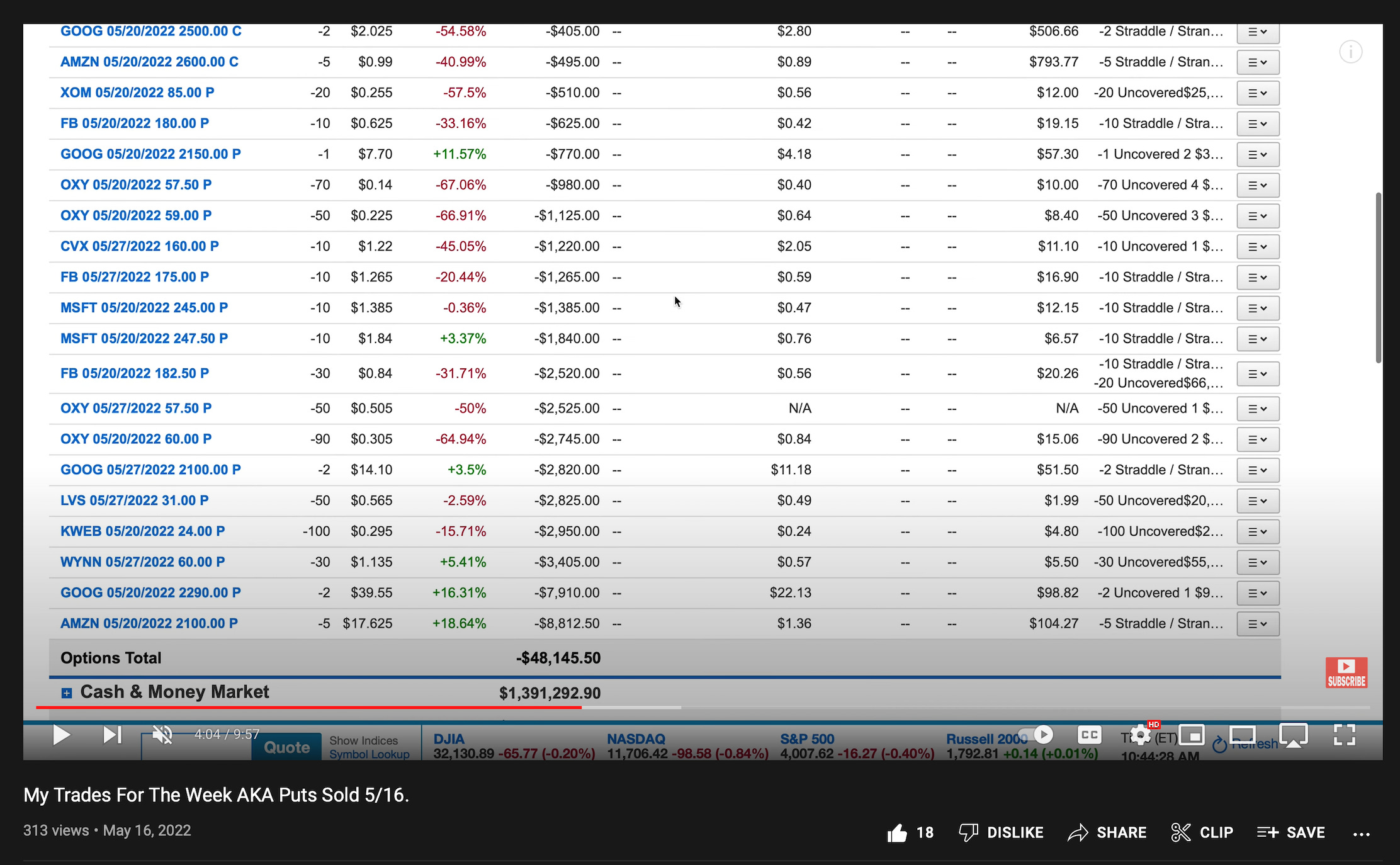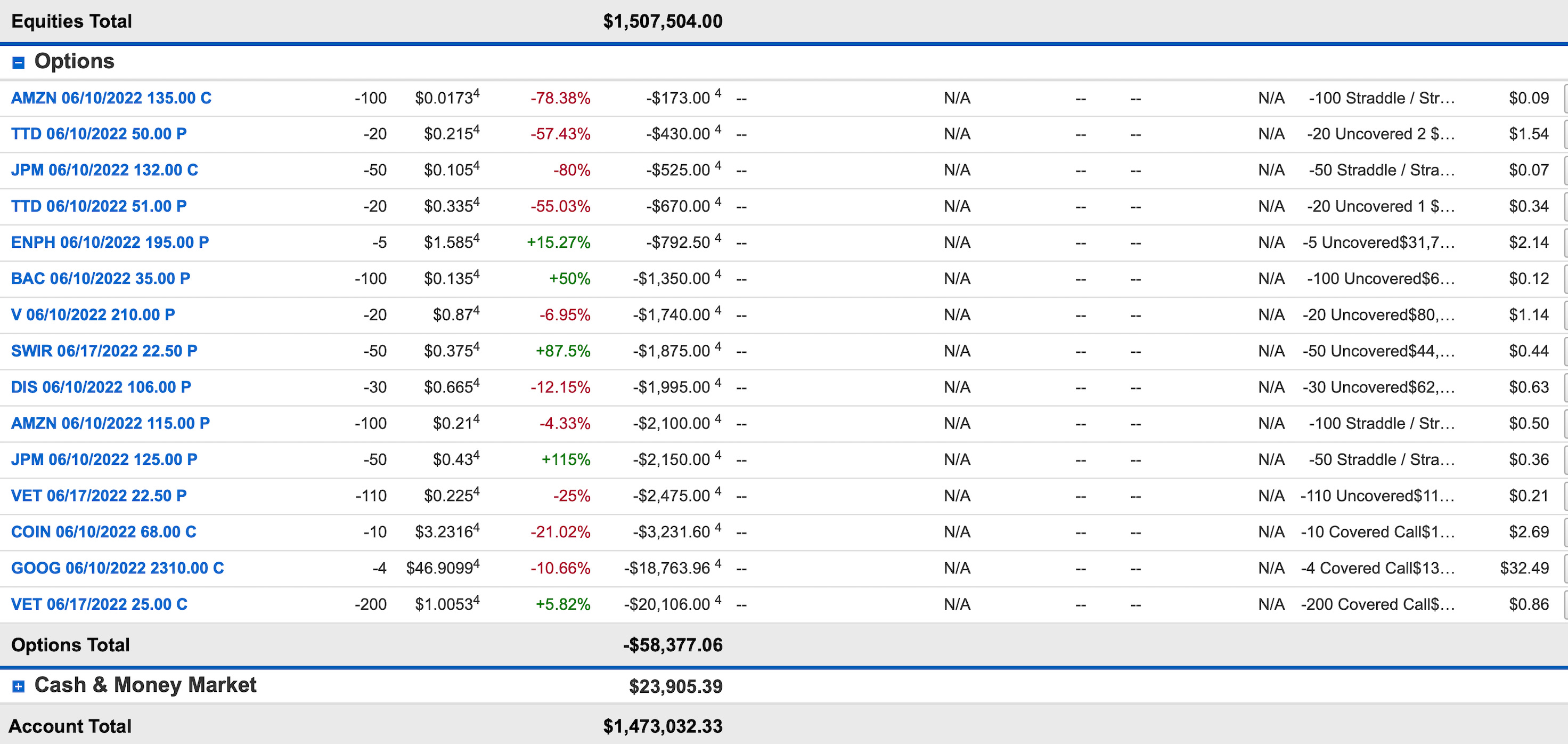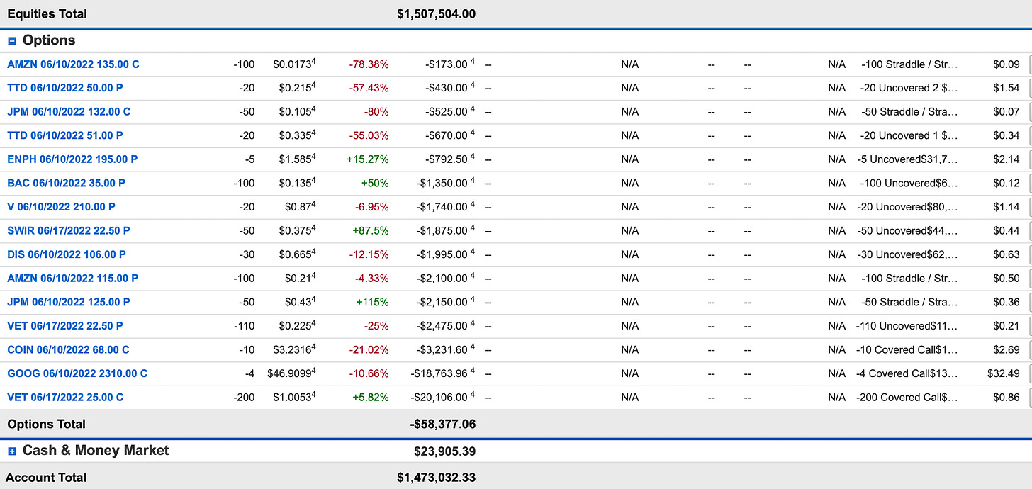 As you can see above my current balance is $1,473,032.33 if you go back to the first time I posted my portfolio on YouTube, the video posted on May 16th titled “ My Trades For the Week AKA Puts Sold 5/16” you can see clearly my balance was $1,391,292.90. Since then I am up $81,739.43 in a little under a month that’s just under 6%. The $SPY closed $400.09 on 5/16 and yesterday it closed at $411.22 so in that timeframe I outperformed the market by 100%. That is why I do what I do in terms of making the market come to me.