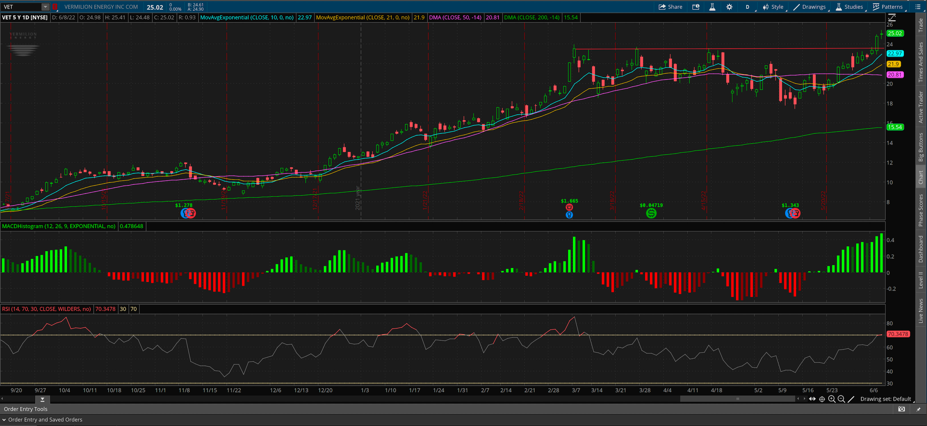 I took a stake in $VET at $24.77 purchasing 20,000 shares and sold an equal amount of $25 calls expiring next Friday vs the position for an average of .86. This is simply a technical trade on a very nice setup in a cheap energy name. This trade has potential to return a little over 4% in 7 market days if the stock closes over $25