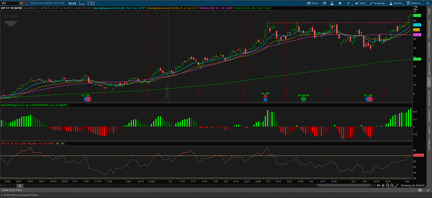 I also sold 110 $VET $22.50 puts expiring next Friday for .21. Again this is a stock im looking for a move up in, the technical setup is right, I sold puts below to lower my average if it gets there.
