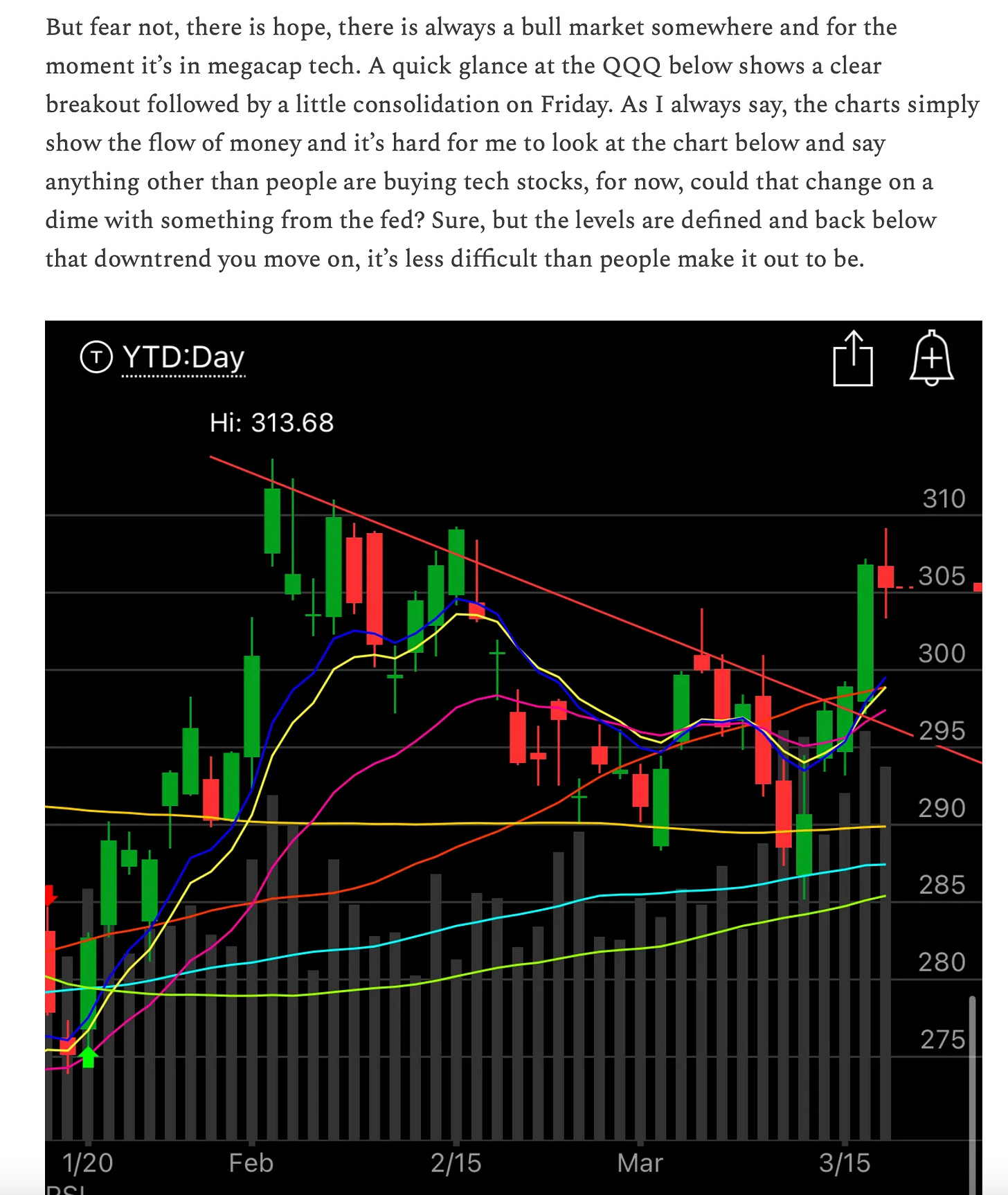 You always hear the fundamental investors proudly pound their chest on how charts don’t matter. What they’re really saying is they have no idea how markets function in the short term and they’re too lazy to take time to learn a new subject so they just hold stocks for years and stocks in general go up over time, hence they eventually make money. The reality is the majority of the market is algos trading back and forth off key moving averages, the patterns that form in the charts simply show buying or selling. It isn’t anywhere near as complex as people make it sound. Think of a candle as a story, and the story is being written and we’re all on the other end interpreting it. That’s it. Go back to my susbtack writeup on 3/19 and you can see this…….