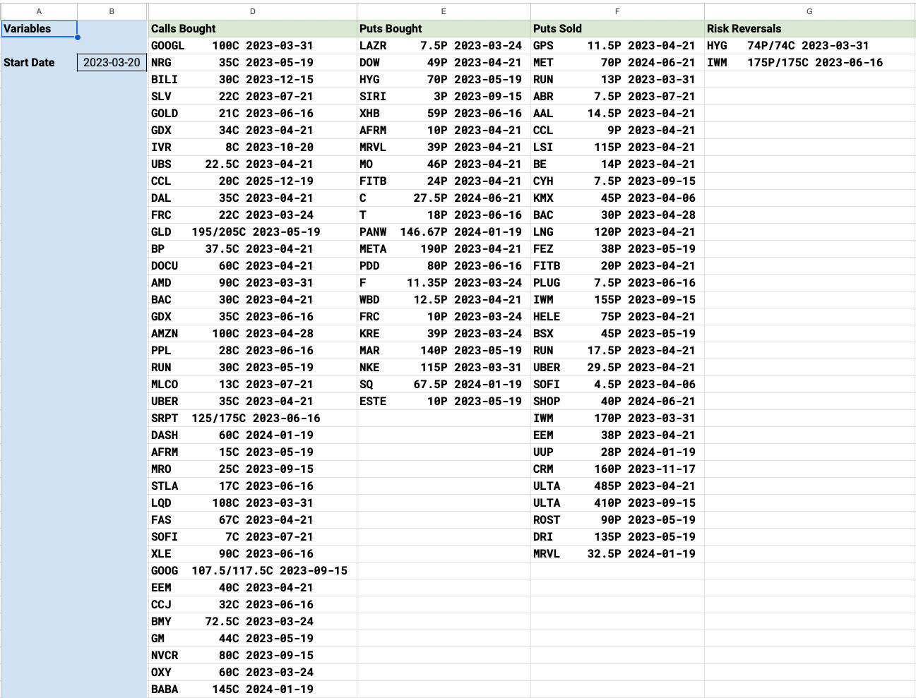 However you like, that’s the beauty of data. I’m simply giving you information on what is trending strong or weak. Daily I give you a table like the one below, 70-100 trades everyday that are showing you what institutional money is doing. Whether you want to sell puts with it, buy shares, buy calls, that’s all up to you. Take this recap from 3/20 as an example. The colums are straightforward: calls bought, puts bought, and puts sold. With calls and puts bought, you never know if they’re hedges vs a long or short position, but if with puts sold, you know that is a level where an institution is looking to get long, so I take those with great importance in looking at levels I want to sell puts at for myself.