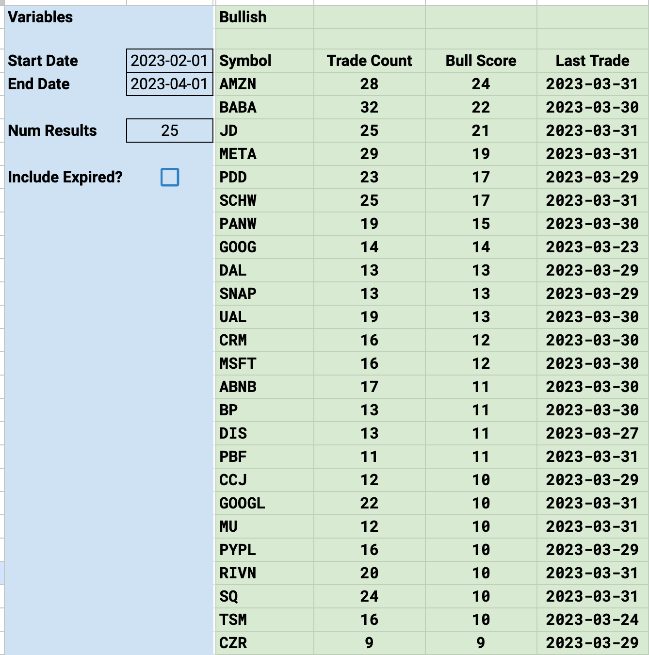 You see me post trends for multiple timeframes daily. Why do I do that? So you can see what is trending. Here are the top 25 trending bullish names the last 2 months, what do you see? How do the trends work? They are just a net score of the trades so when it says 28 trades were placed and a bull score of 24 that means 26 trades were bullish and 2 were bearish to get to 24. Many of the names at the top were the ones with the biggest moves recently. So the trends allow you to see the most bullish/bearish names over multiple timeframes to see how you want to think of things shorter and longer term.