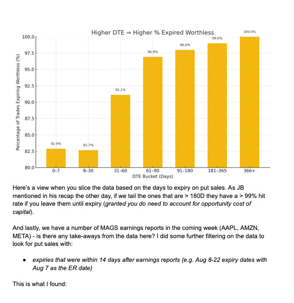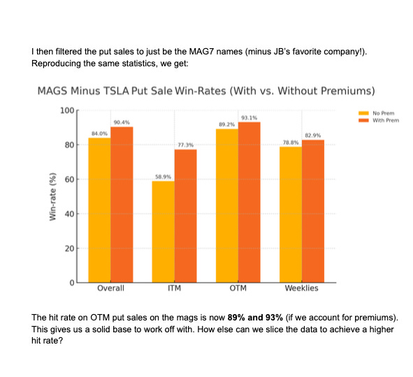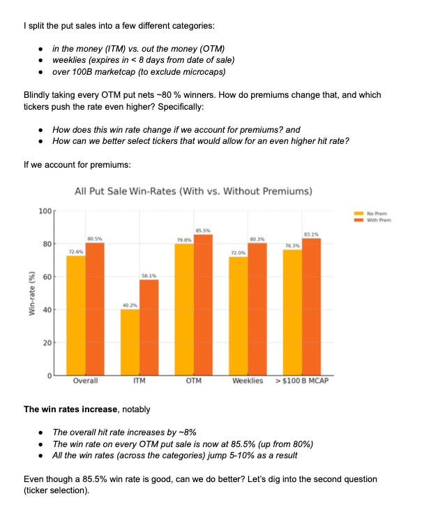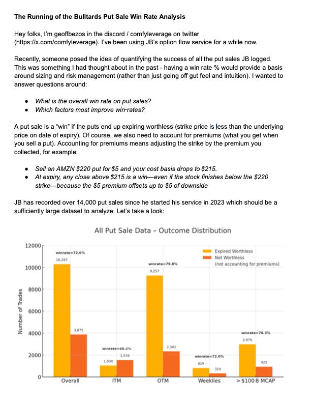 I am sharing an extra post this week, tomorrow I will have a best idea for this coming week but I wanted to let someone else I know and trust discuss some of his findings regarding the put sales in my database. I hope you enjoy this and start to understand why I always say the put sale column is the most valuable datapoint in all the data I share. He sent me a PDF so I’m attaching screenshots of it in here because there was no other way to embed it. Hopefully this sheds some light into why I trade in the manner I do which is simply looking at directional data in my database and trying to conservatively sell puts lower and catch the drift higher. Would I make more buying shares? Sure, but I also take on significantly more risk, by selling puts I can still profit even if share prices decline. That is the main point of emphasis here, the data is being organized either way, if you think a stock is going up, why not put on a higher probability trade selling puts on it materially lower. Again remember every stock is a buy somewhere, that somewhere is visible on a chart by looking at the various moving averages. I know it sounds intimidating but when you put it all together with option flow and charts you increase your probabilities of a successful trade manyfold. Anyways enjoy, I’m going to make a separate channel within the discord for all of you to discuss this stuff it will be called put sale data.
