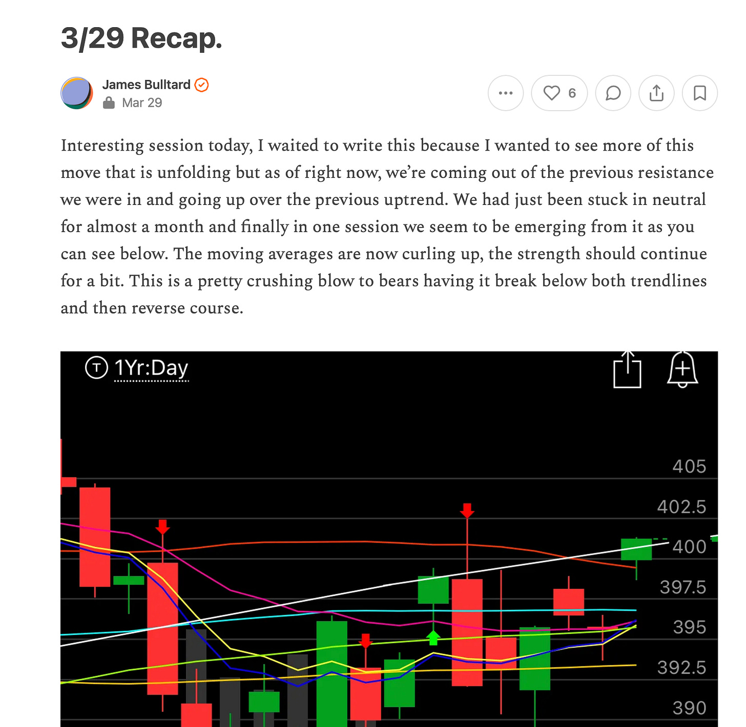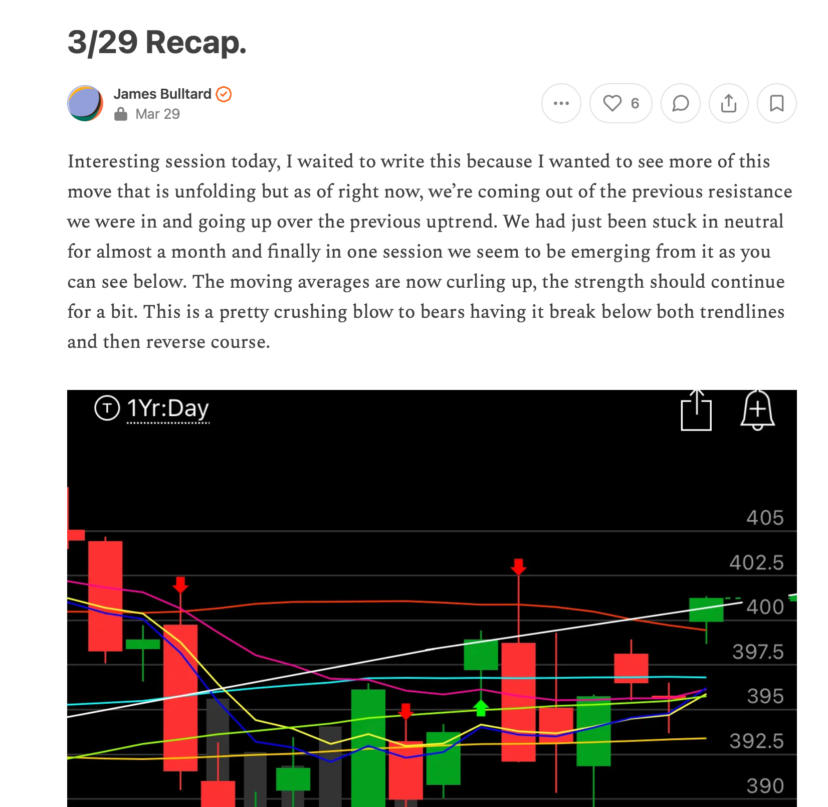 I've been with this substack for some time now and imo it's a great tool to leverage for trading, as well as learning. I've been in many rooms, including the power trading room, to Sam's room during covid. Those charge 5 to 7x more....Nothing beats the knowledge transfer that occurs with Bulltard. He's one of the best charter I've come across if not the best. Also his order flow has been top notch. It's obvious Bulltard is a professional and I can't imagine anyone getting a better bang for their buck if they're interested in trading.