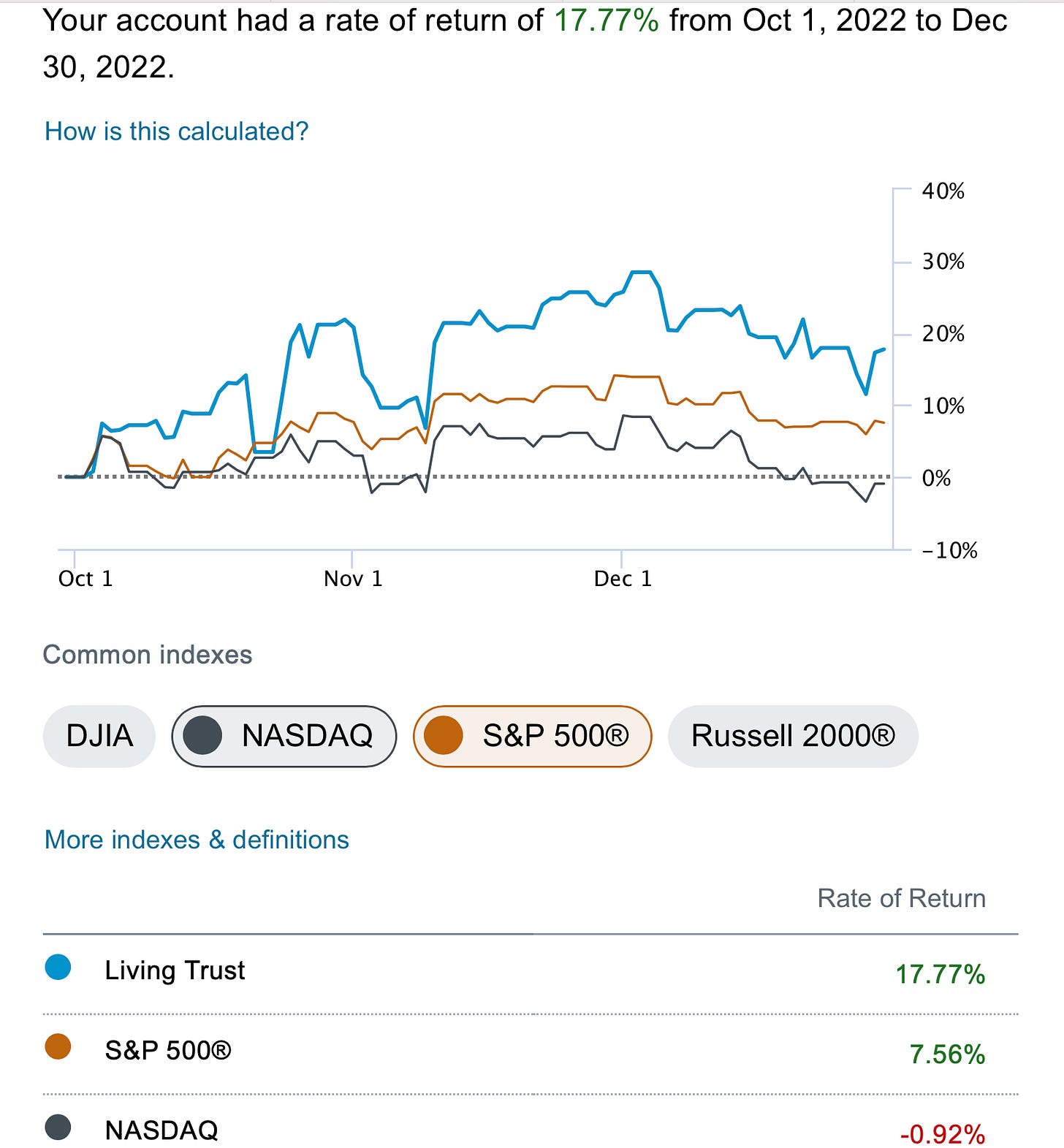 This particular quarter was another solid one for me. I returned closed to 18% vs 7.5% for the S&P while the Nasdaq was slightly negative. Obviously alot of the outperformance this quarter was due to Twitter and the closing of that deal in late August, but I also used the last few weeks of the quarter to position myself for 2023 by selling alot of January 2024 puts which went down hard at the end of the year as the market declined. Those will likely lead to some significant outperformance later in 2023.