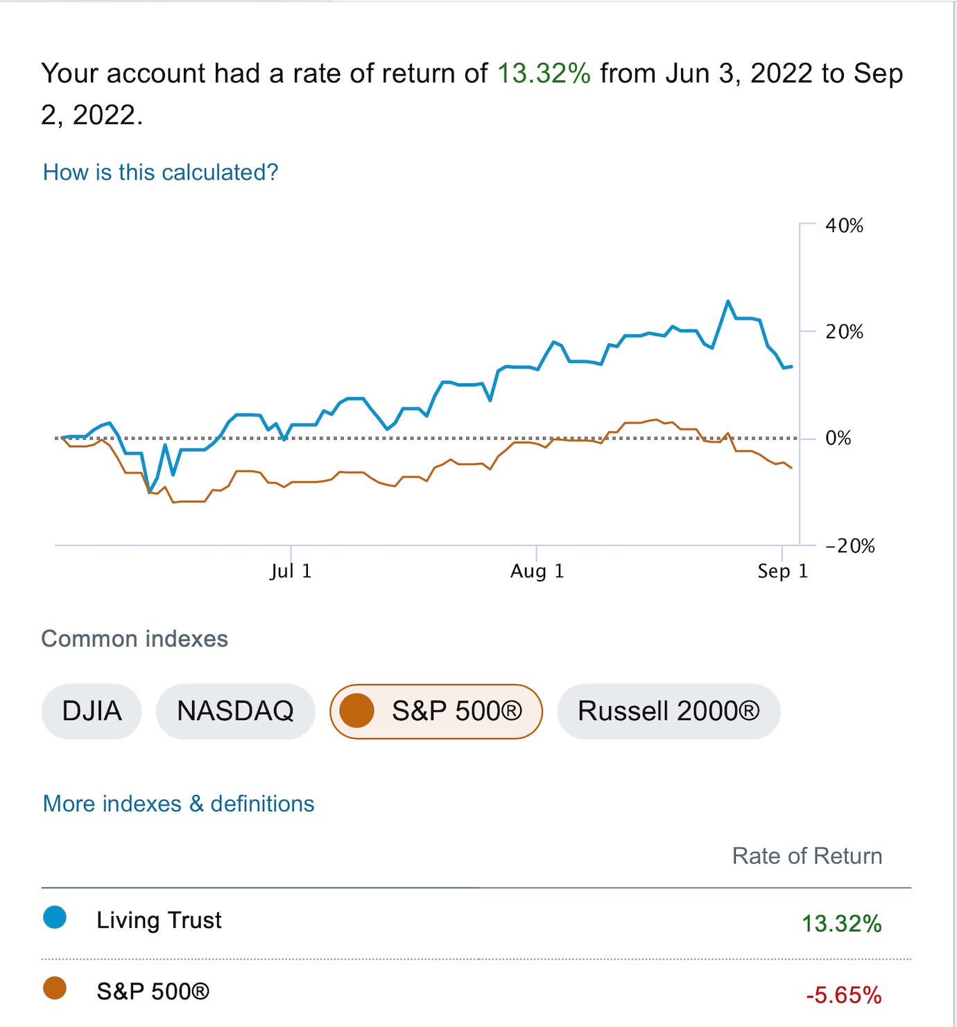 PS -someone asked me about my comment yesterday in regards to outperforming the market by 20% since I started this substack, this is what I was referring to, even after getting dinged a little this past week, I’m still up 13.32% since June 3 vs a -5.65% return for the market in that timeframe. That is using Schwab’s rate of return for the last 3 months tool.