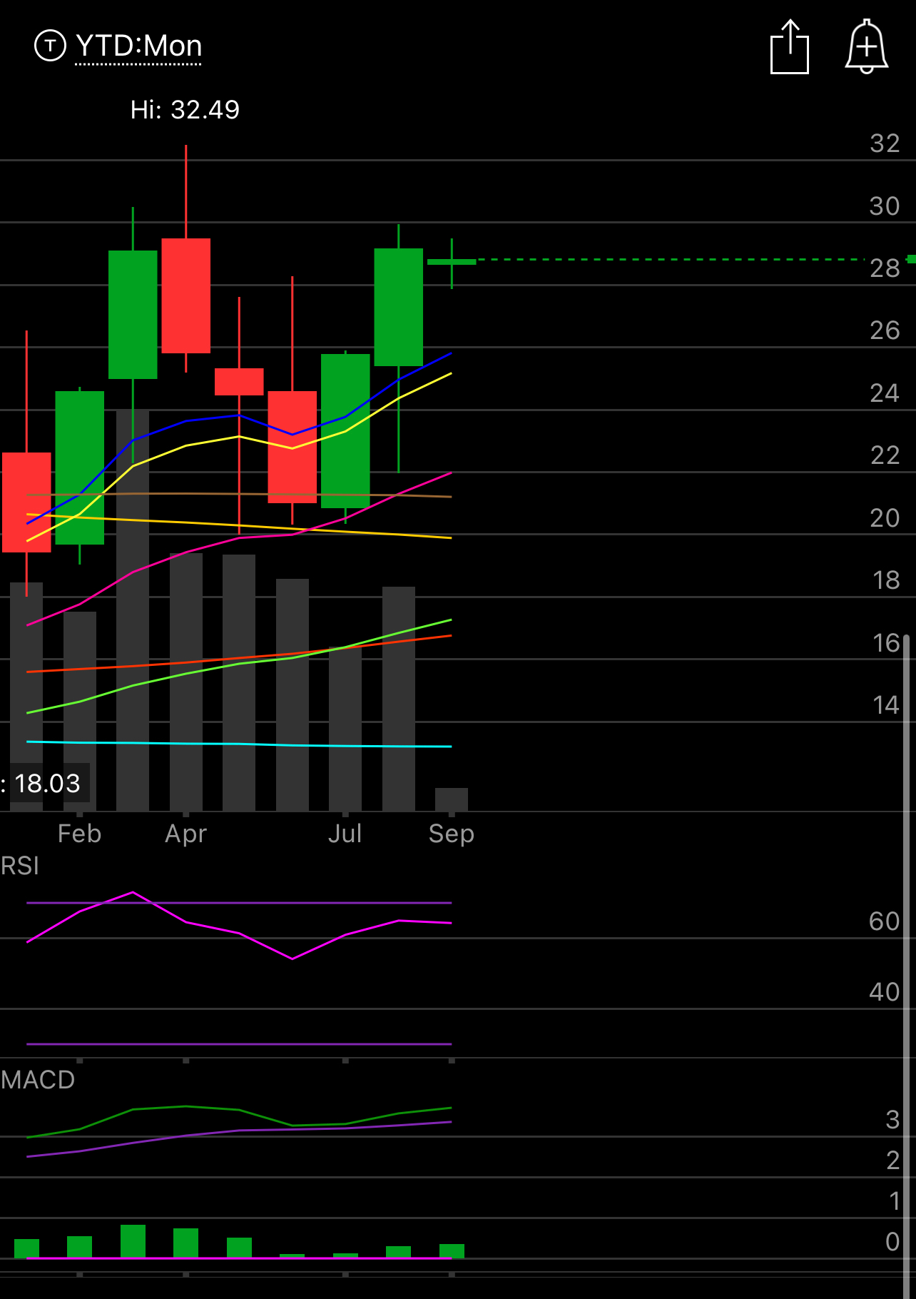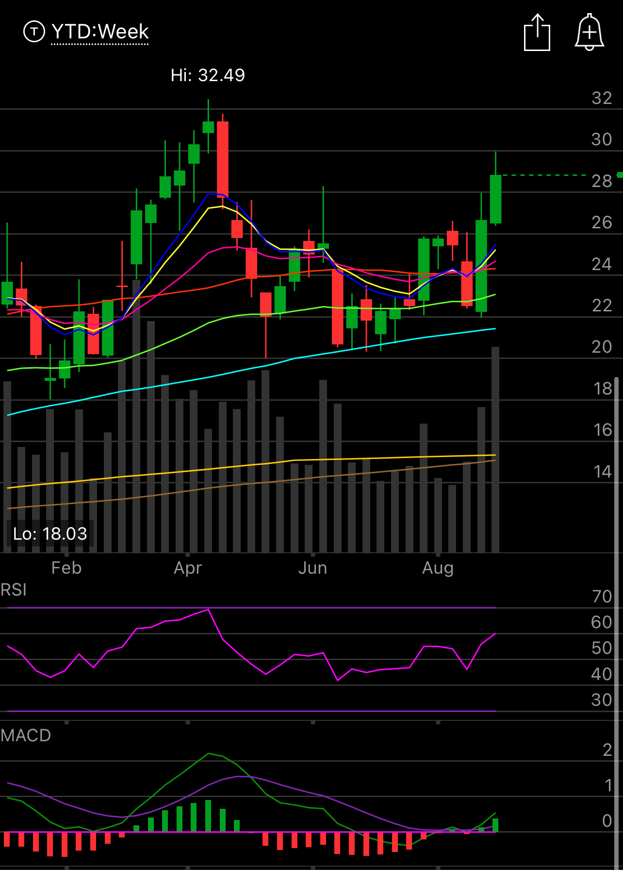 The Monthly also shows a bullish divergence with all the key moving averages sloping up with $26 looking like logical support this month. My trade targets a long at 26.88 so if I’m stuck with shares I can sell covered calls afterwards, hence my lack of concern getting put shares.