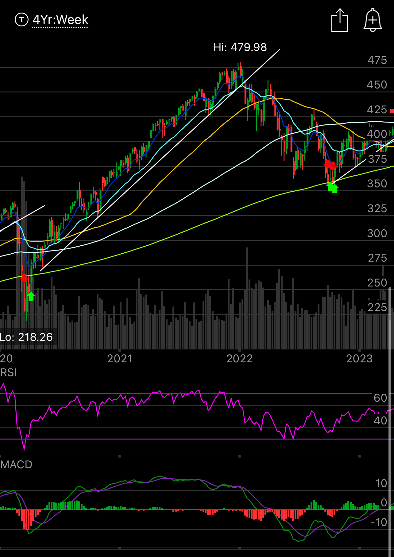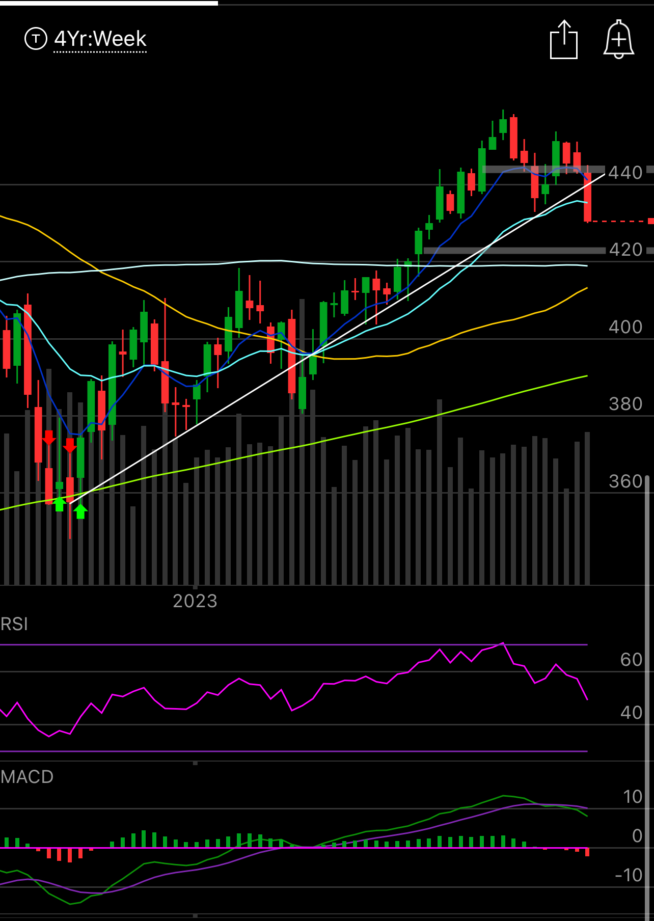 And here we have the current break of trend. March was interesting because the breakdowns were saved by 4 different monster earnings releases from mega caps. We have Microsoft, Meta, Apple, and Nvidia all reporting huge quarters and their massive moves saved all 4 of the individual breakdowns with a massive gap up, what is the catalyst to save us this time? If it’s earnings for big tech, that is a month away, so naturally it seems probable, based on the past, that we drift down to 420 at a minimum and a decent probability we move down below 400 to that green line.