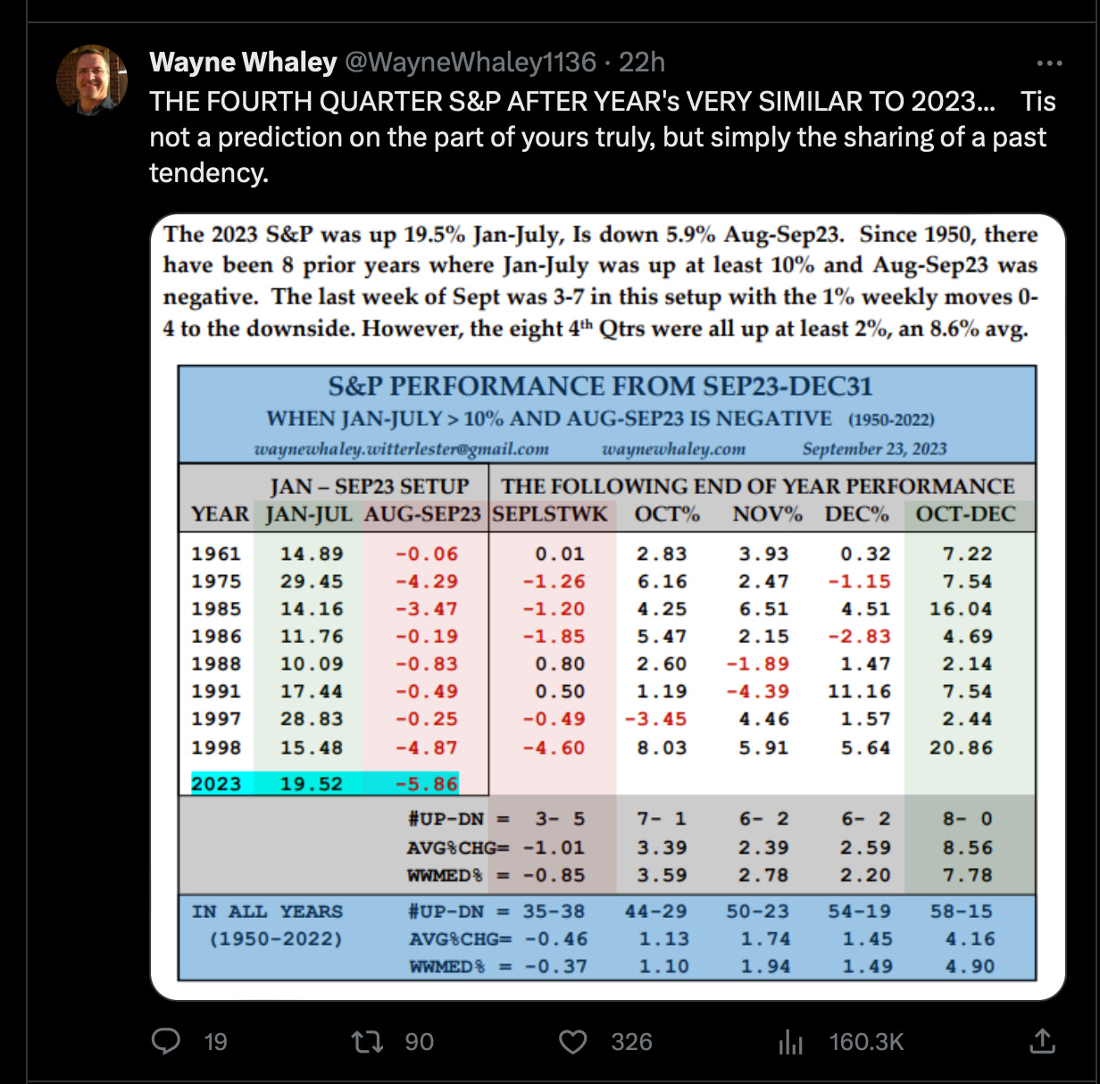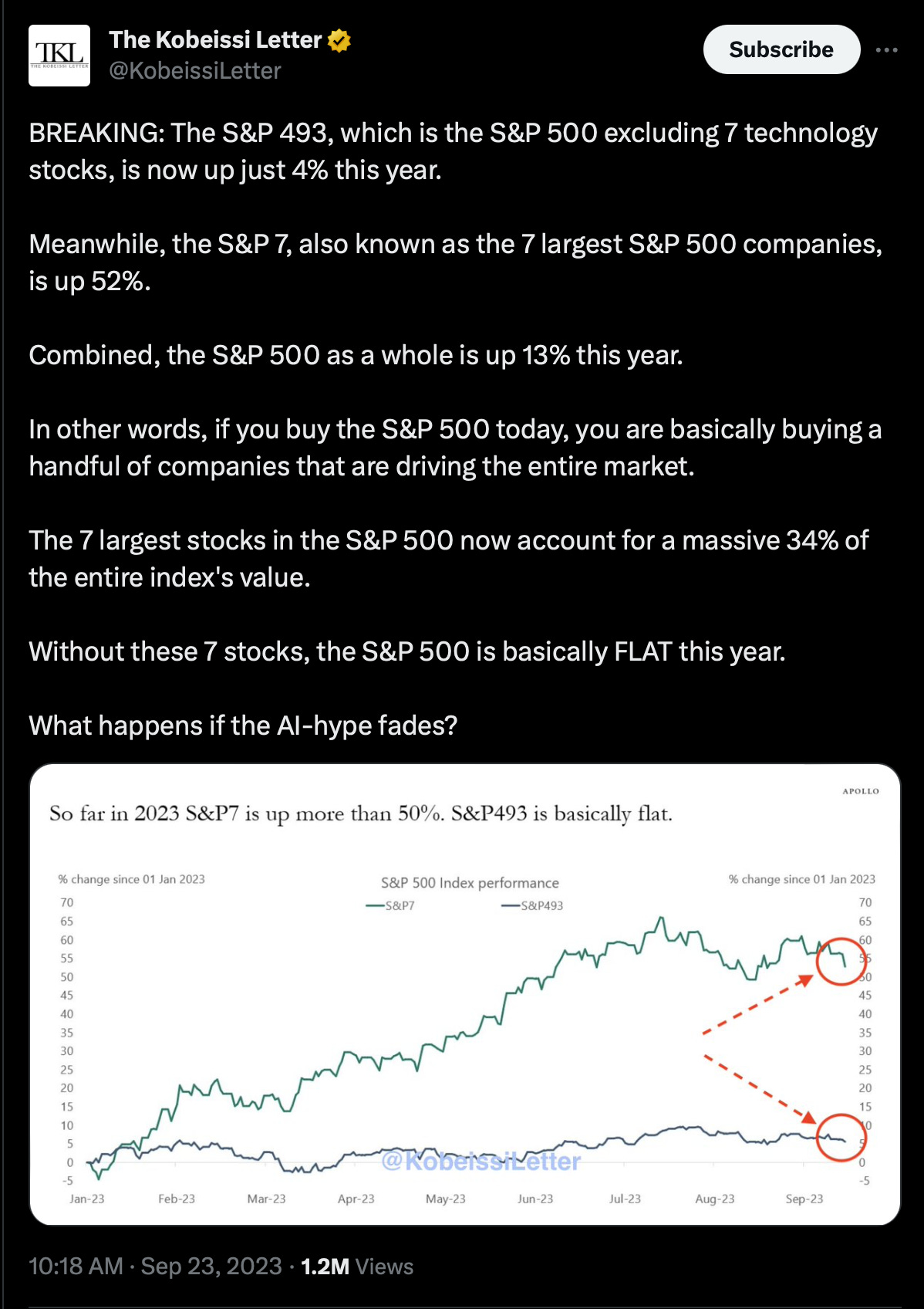 First off our market is completely driven by megacap tech, I’ve said it before but the tweet below highlights it even more. The 7 largest stocks make up 34% of the S&P. That is Apple,Microsoft, Google,Amazon,Nvidia,Meta, and Tesla.