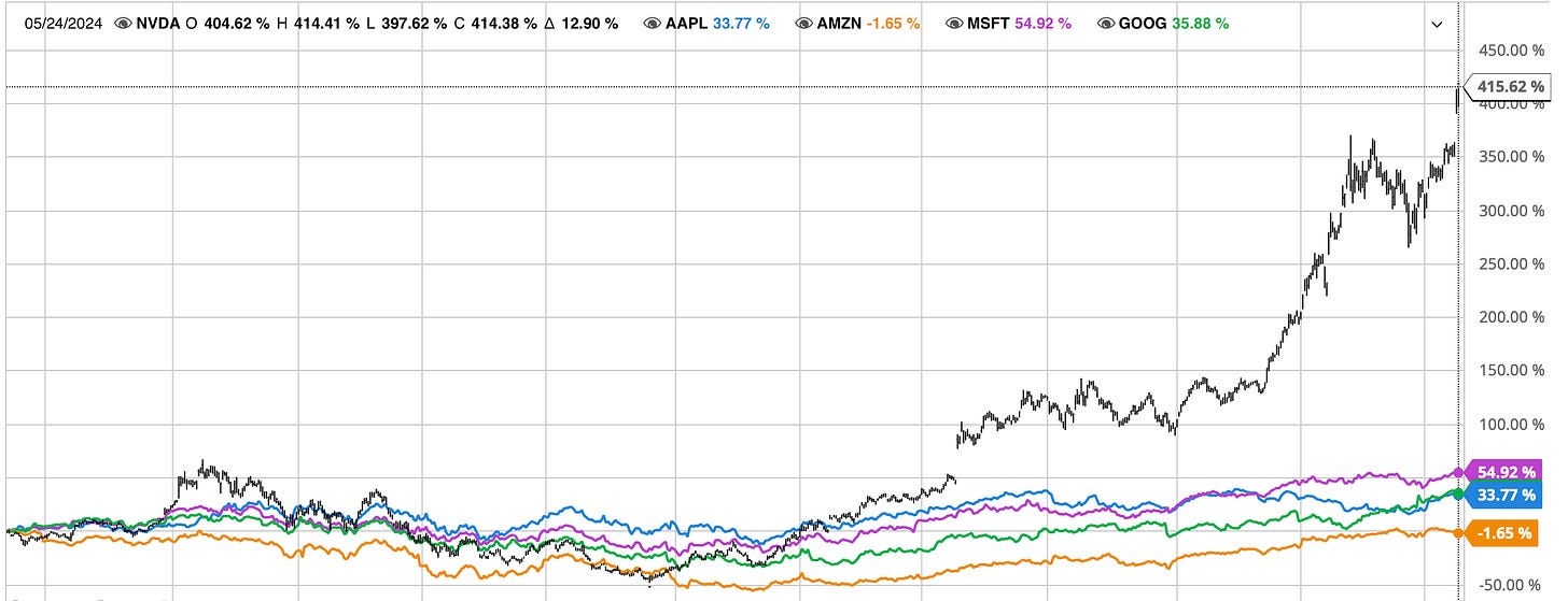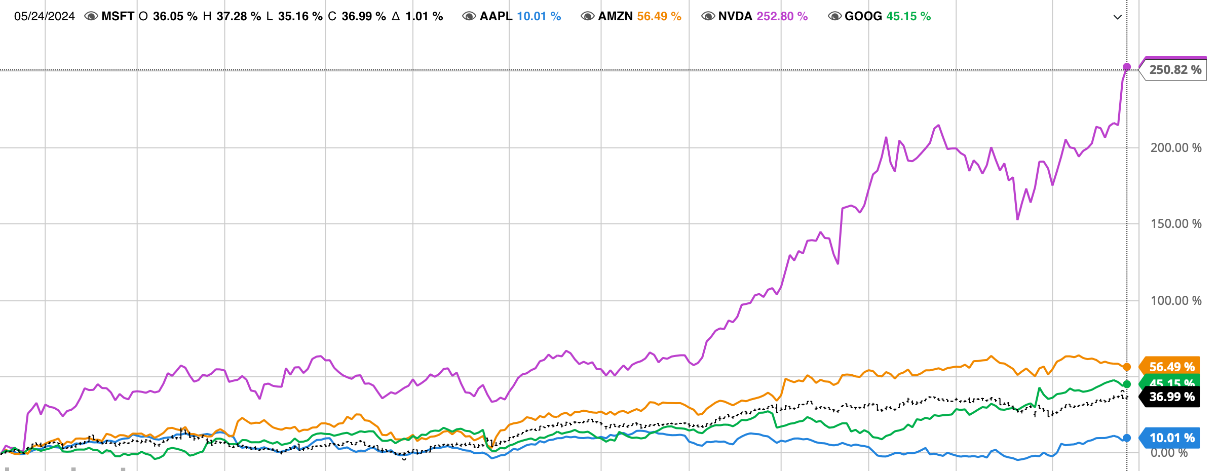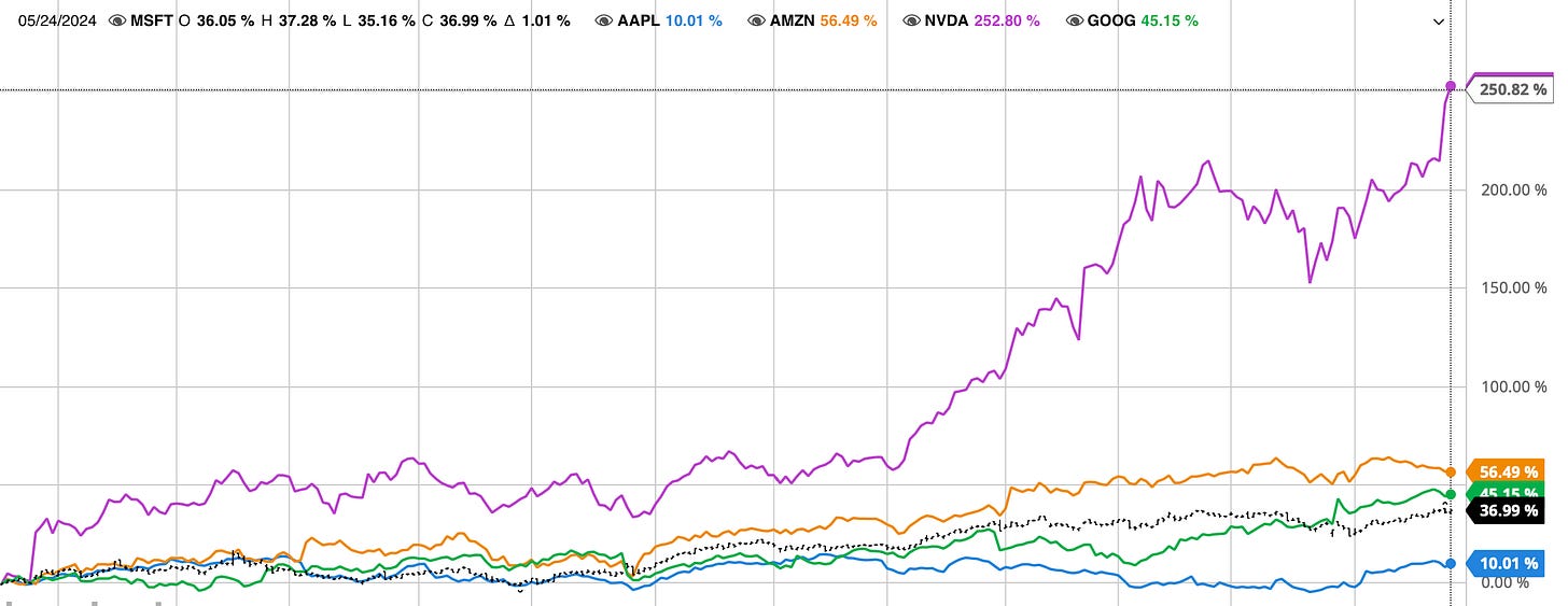 If you just step back and look at the big names since we entered AMZN is up 56.5% since last May. Google is up 45%, Microsoft is up 37%, Apple is up 10%. Only NVDA in the big 5 has a better return.