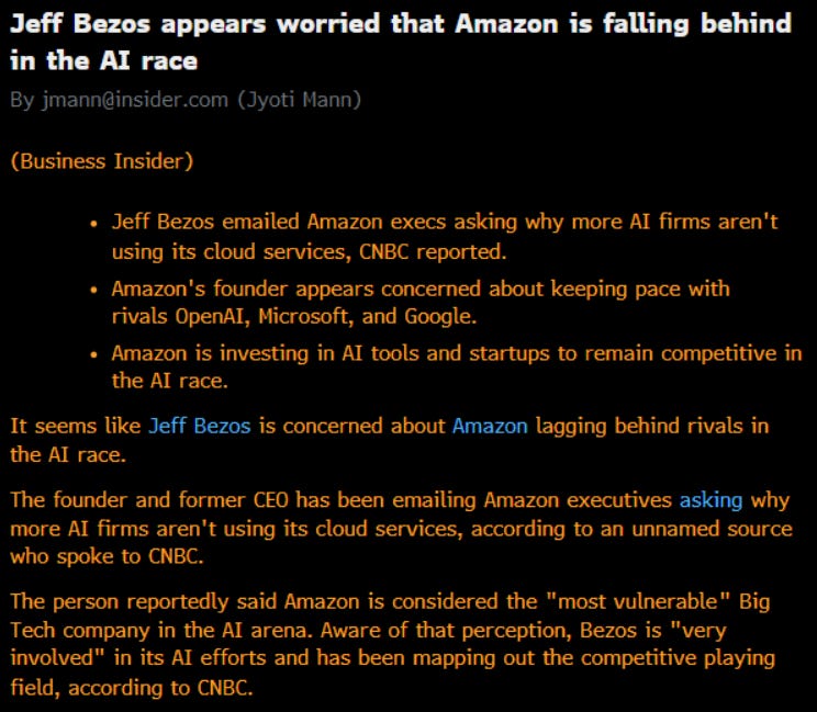 That’s about it. That sums up what happened. You have the Chairman of Amazon saying he is concerned about AWS in regards to AI when and on the last earnings call Amazon said Capex was going to rise dramatically to numbers they couldn’t even pinpoint with most of it focused on AI because Andy Jassy keeps saying it is the biggest opportunity of his lifetime.
