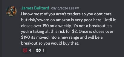To begin, you all know that I have quite the pulse on the market, just looking at charts and moving averages I can usually give you a good direction on what is coming. Back on May 10th in the Amazon channel on the discord I said Amazon wasn’t a good risk/reward after the failed breakout.