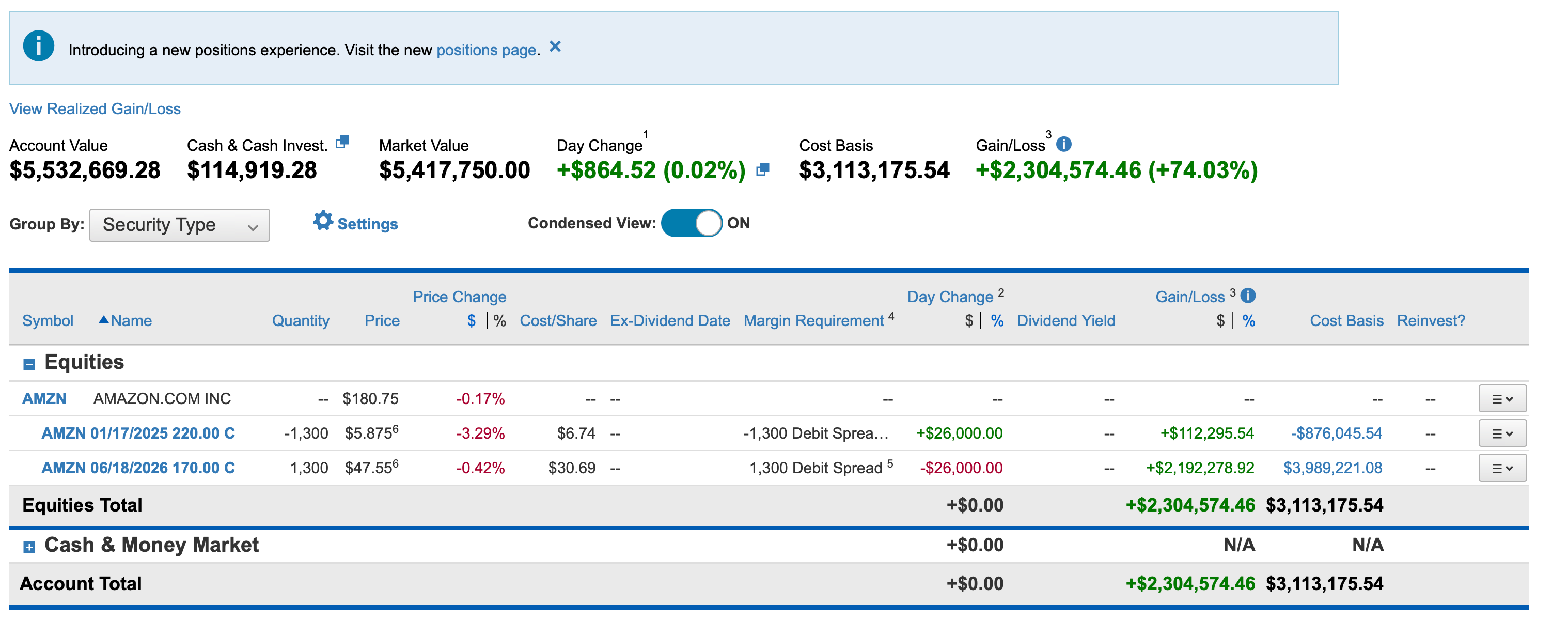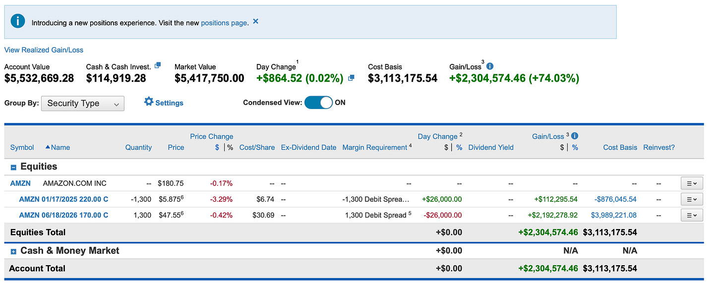 So why didn’t I sell? You all know my positioning here, I’ve discussed it in depth multiple times. I went long with my full trading book on May 18, 2023 in this post here and I held on until early January this year where I adjusted higher in this post on January 8, 2024 here. I now thanks to the move Amazon has made since and while I’d love to maneuver around I’m sitting on a pretty large gain right now of $2.3M after this recent decline we had. Selling now would be hundreds of thousands in unnecessary taxes so I’ve made adjustments via short calls but I’m really trying to go for a long term capital gain on this size. I’m trying to ride this out until January at least before I decide how much to trim to focus on other things.