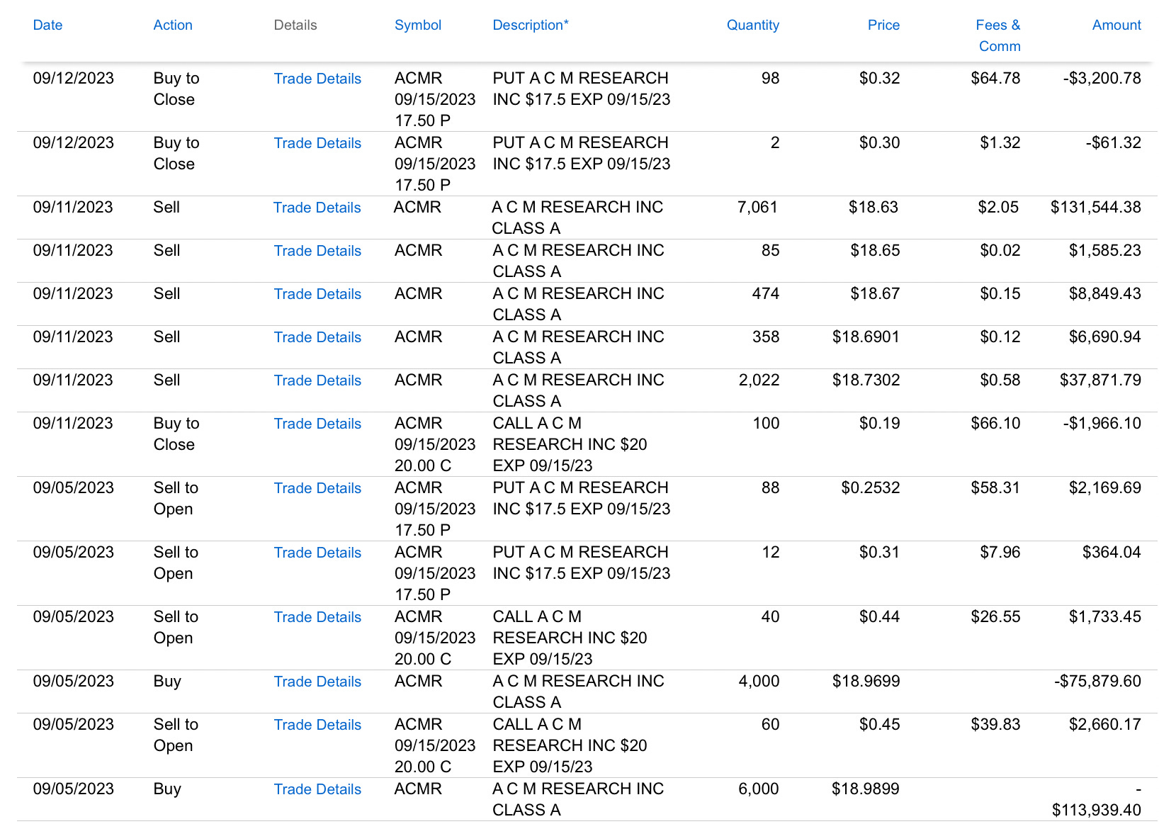 Here is my transaction log for all my ACMR trades, that day you can see I bought 10,000 shares at an average of $18.97 and I sold a covered call at $20 for 9/15 on an equal amount of shares, 100, for .44/.45. I also sold some puts lower at 17.50
