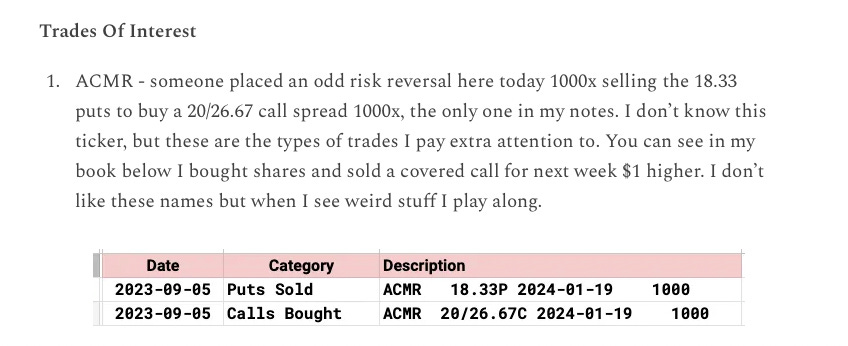 More than that, as I’ve said many times, the whole purpose here is to try to note the trades, catalog the bets to try and gain an edge on direction names are going in and to play that, not to play the specific trades as they’re placed. As you saw I didn’t take that ACMR risk reversal exactly, I played it pretty conservatively buying shares and selling covered calls, if I wanted to I could have sold for a gain shortly after buying, but I gave the trade a shot and it didn’t work out. You see the bets, but how you play them can vary tremendously. The bottom line is you might have access to seeing what is being traded but you still have to know when to cut your losses, for me it was a very tight stop because I didn’t like the chart and moreover I didn’t know the name or feel comfortable with it.
