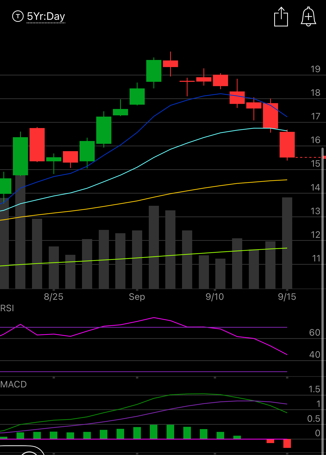 Now, you can see 6 days later, this past Monday I closed up that trade and if you look at my recap on 9/12, here, you see ACMR with “0” next to it because I had sold out of it the day before. As you can see above I lost something like .30/share but you can see I closed my covered calls for .19 from .45 so I gained .26 there all in all I lost peanuts maybe .05/share but the price action below wasn’t encouraging, the macd was rolling over and frankly I didn’t know this name, so I closed it.